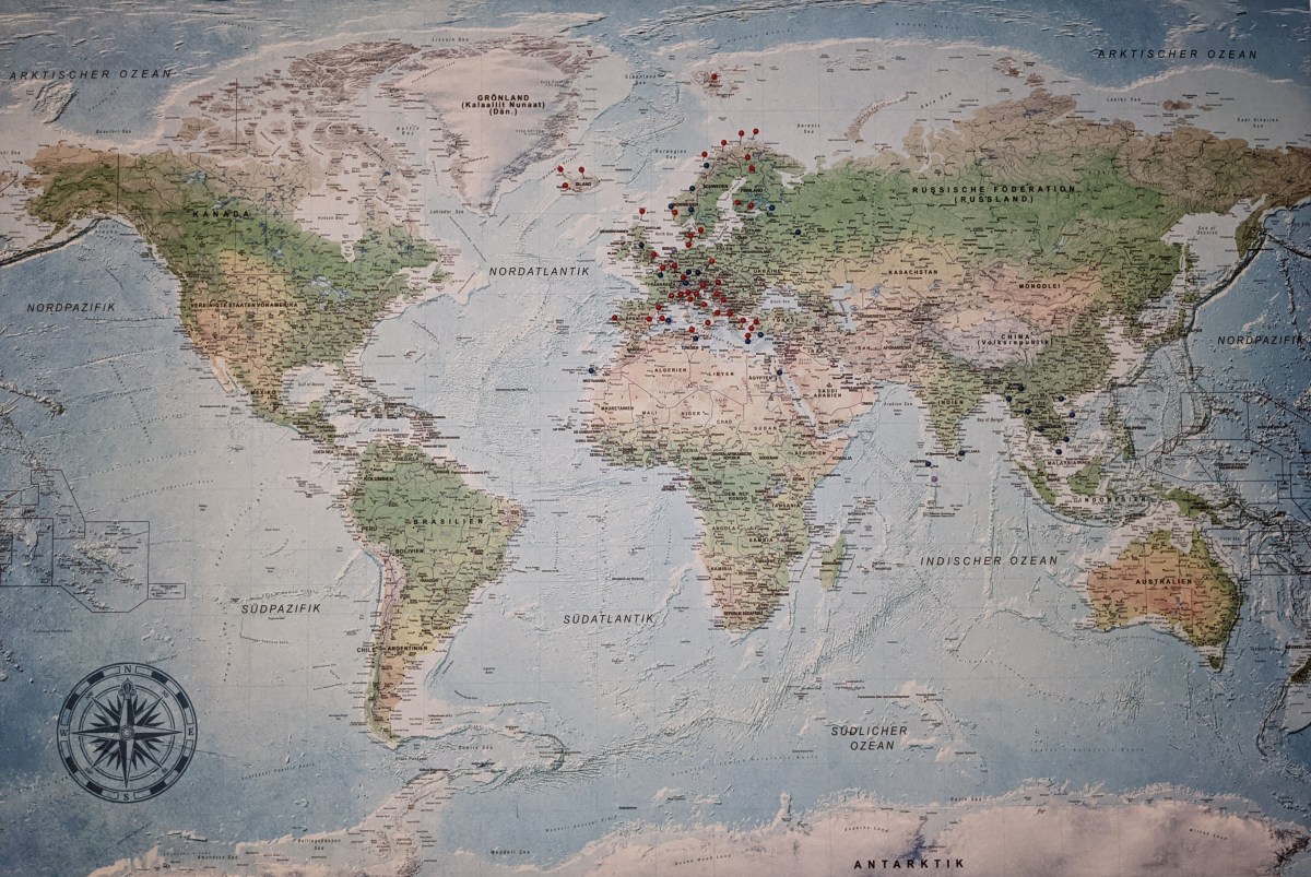 Die Weltkarte, die ich diesen Beitrag hinzugefügt habe, hängt schon seit längerem in meinem Büro. Die roten Stecknadel zeigen meine Reisen, die blauen Stecknadeln zeigen die Reisen von meinem Freund und die lila Stecknadeln zeigen unsere gemeinsamen Reiseziele. Davon gibt es leider noch nicht sehr viele – doch das soll sich durch die gemeinsame Weltreise ändern. Wir wollen uns ganz viel ansehen und wenn wir wieder nach Hause kommen, werden wir die Weltkarte mit ganz vielen lila Stecknadeln bereichern.