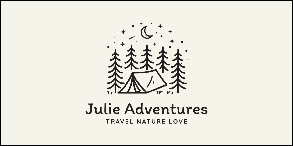 Nachdem ich einen Name hatte, musste ich mir noch ein Logo überlegen. Beim Logo war es mir wichtig, dass es einfach ist und einen guten Wiedererkennungswert hat. Der Name „Julie Adventures“ sollte auch inbegriffen sein. Damit das Logo auch gleich etwas zum Inhalt verrät, habe ich „Travel Nature Love“ hinzugefügt. Ich reise liebend gerne, bin sehr gerne in der Natur und außerdem mache ich alles mit viel Liebe. Das Icon mit dem Wald und dem Sternenhimmel gefällt mir sehr gut und deutet auf die Naturverbundenheit hin. Das Zelt in der Mitte soll meine Reiselust widerspiegeln.