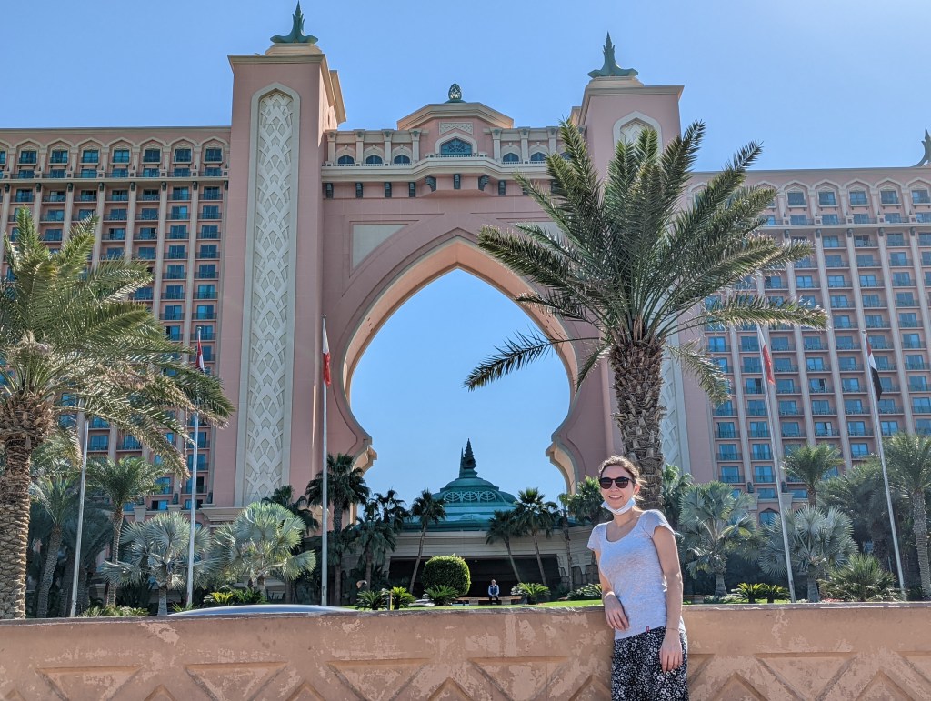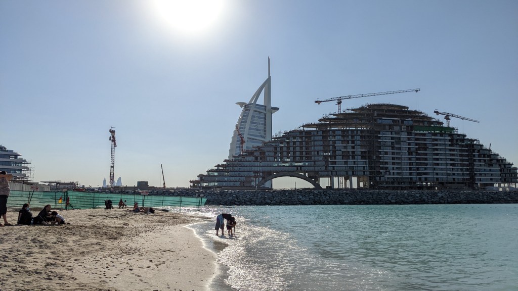 Danach haben wir uns auf dem Weg zum Burj al Arab gemacht. Da es eine Busstation gibt, die sich genau so nennt, dachten wir, dass der Anreise und Besichtigung nichts im Wege steht. Doch als wir ausgestiegen sind und den Pfeilen folgten, kamen wir nur zu einem Ticketverkaufsstand für „Inside Burj al Arab“. Da wir jedoch schon in einigen Hochhäusern waren, wollten wir uns das Ticket nicht kaufen und den Burj al Arab einfach von außen aus anschauen. Dann haben wir uns auf den Weg gemacht und hofften auf einen öffentlichen Strand zu kommen. Leider war das jedoch eine schwierige Angelegenheit. Vom öffentlichen Strand aus konnte man den Burj al Arab nicht gut sehen, weil dazwischen gerade ein Hotel ins Meer gebaut wird. Die Strände rund um den Burj al Arab gehören zu Hotels und nachdem wir es auf der anderen Seite noch einmal versucht hätten, haben wir aufgegeben. Wir sind zu dem Entschluss gekommen, dass wir es total schade finden, dass alles verbaut wird und man sich eine wichtige Sehenswürdigkeit nur ansehen kann, wenn man ein Hotel in der Nähe bucht.