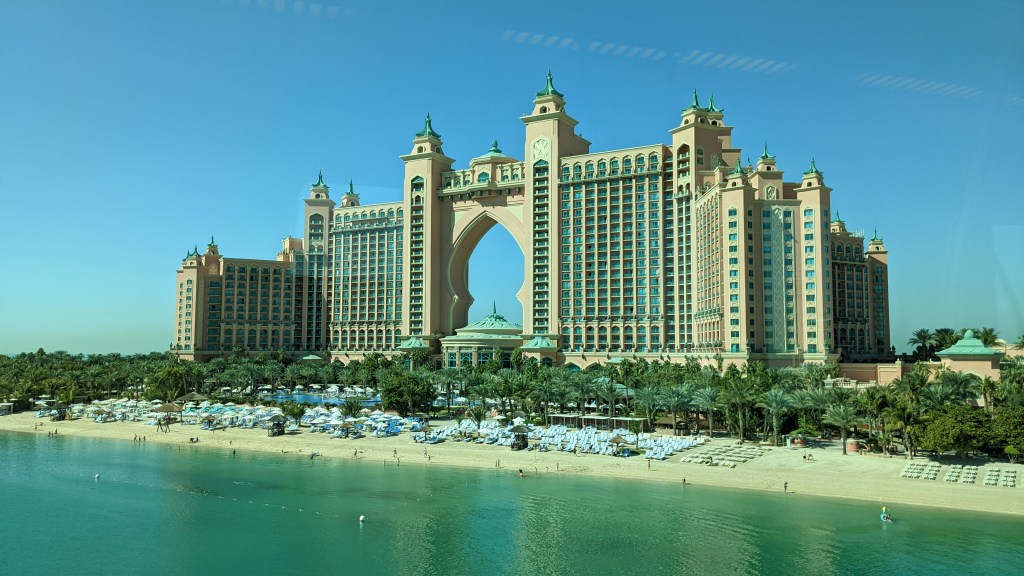 Entlang des Stammes der Palme der Palmeninsel Jumareih fährt die Monorail. Natürlich haben wir uns diese Palmeninsel auch näher angesehen und deshalb sind wir mit dieser Monorail bis ans Ende zur Palmenspitze gefahren. Die Struktur der Palme kann man leider aus der Nähe nicht erkennen. Als wir am Burj Khalifa oben waren, konnten wir erkennen, dass es eine Palme ist und auch beim Weiterflug haben wir die Palme von oben sehen können. Wenn man direkt dort ist, sieht man nur dass zwischen den einzelnen „Palmenblättern“ das Meer ist aber das große Ganze kann man nicht erkennen.