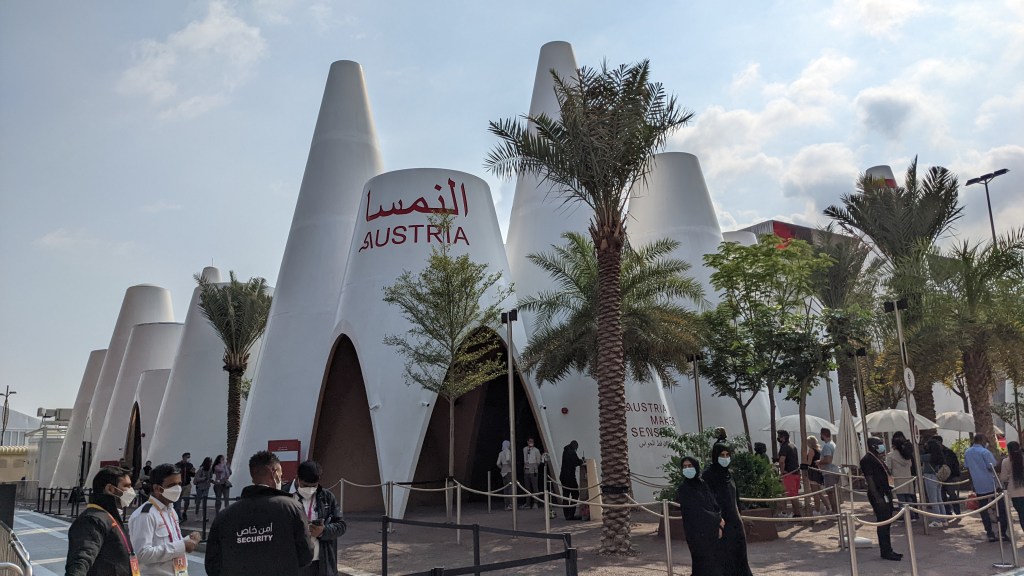 Der österreichische Pavillon war für uns natürlich besonders interessant und ich kann euch sagen, darauf können wir wirklich stolz sein. Es gibt einige Gemeinsamkeiten zwischen Österreich und den Vereinigten Arabischen Emiraten. Nämlich dass beide Länder ungefähr gleich viele Einwohner haben und auch die Größe vom Land selbst ist sehr ähnlich und dann kommt noch dazu, dass sowohl in Österreich als auch den Vereinigten Arabischen Emiraten gerne Kaffee getrunken wird. Der Pavillon besteht aus mehreren Kegeln, die mit importierten Material aus Österreich erbaut wurden. Aufgrund der Bauweise ist keine elektrische Klimatisierung nötig, die Kegel sind aber angenehm kühl und werden gut durchlüftet – deshalb braucht der österreichische Pavillon im Vergleich zu anderen sehr wenig Energie.