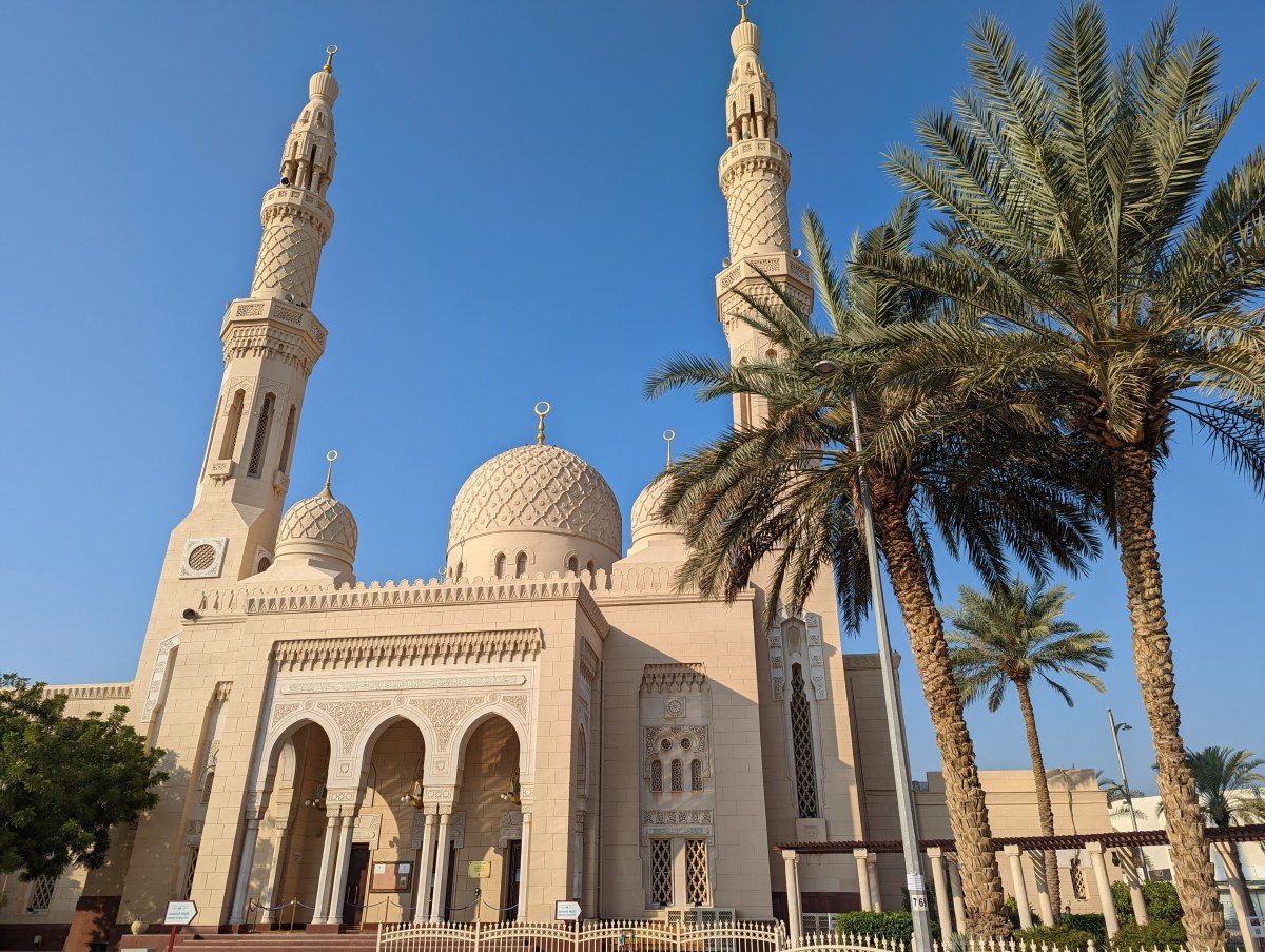 In Dubai ist die offizielle Staatsreligion der Islam. Das merkt man auch sehr rasch, denn man hört mehrmals täglich überall in der Stadt den Muezzin, der an die Gebetszeiten erinnern soll. Überall in der Stadt sind auch Gebetsräume verteilt, meistens in der Nähe von den Toiletten und nach den Geschlechtern getrennt. Um auch den religiösen Kulturanteil von Dubai kennenzulernen, haben wir am letzten Tag die Zentralmoschee Jumeirah besucht.