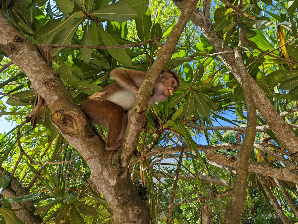 Was ich euch auch unbedingt noch erzählen muss ist ein besonderer Besuch am Strand. Direkt über unserem Strandtuch hörten wir Geräusche vom Baum kommend. Als wir nach oben schauten, sahen wir einen Affen, der ein Plastiksackerl voll Obst in den Händen hatte. Er hat das Obst herausgeholt und gefressen. Es sind dann auch noch weitere Affen gekommen, die sich über die Beute hermachten. Wenig später kam ein Pärchen, das neben uns am Strand lag, von der Kaffeepause zurück und es hat etwas gefehlt. Das Sackerl Obst haben sie sich gekauft und wurde von den Affen gestohlen und gefressen. Das war wirklich ein lustiger Moment – also passt auf euer Obst immer gut auf!