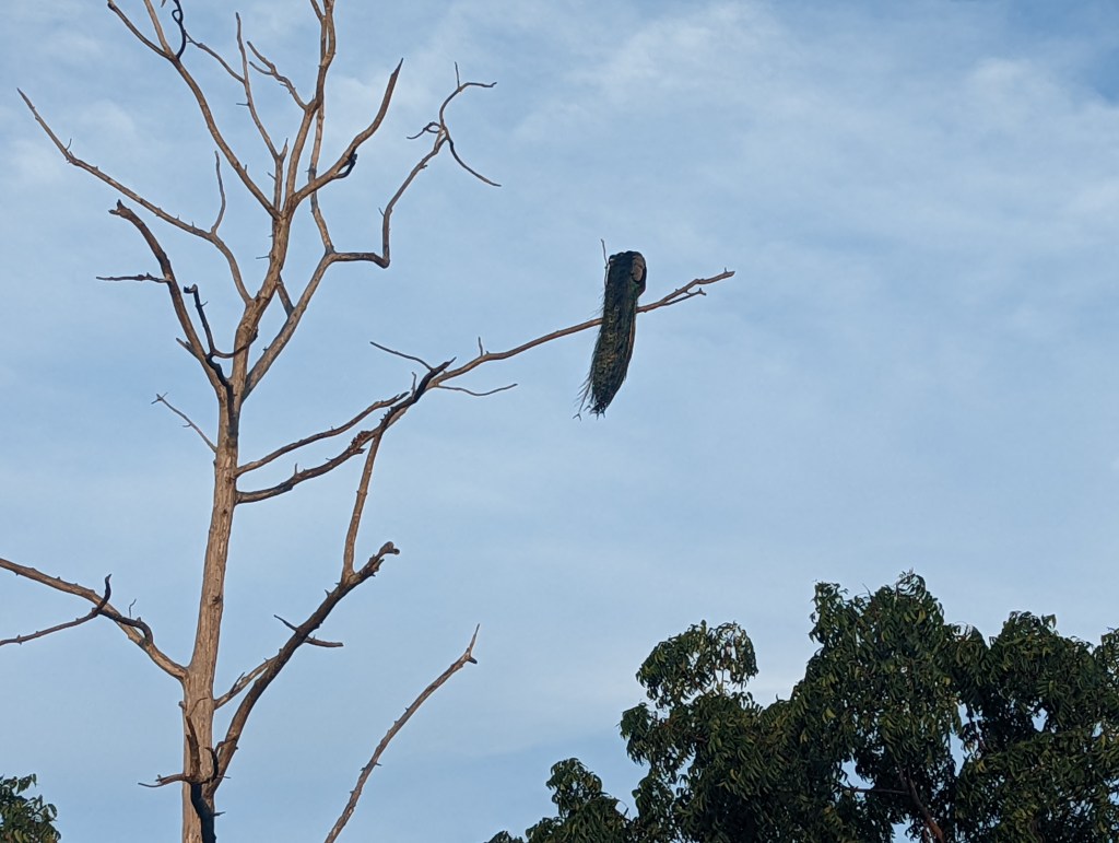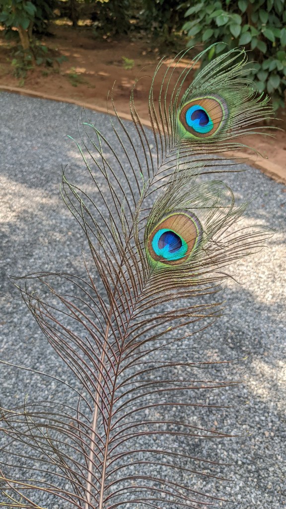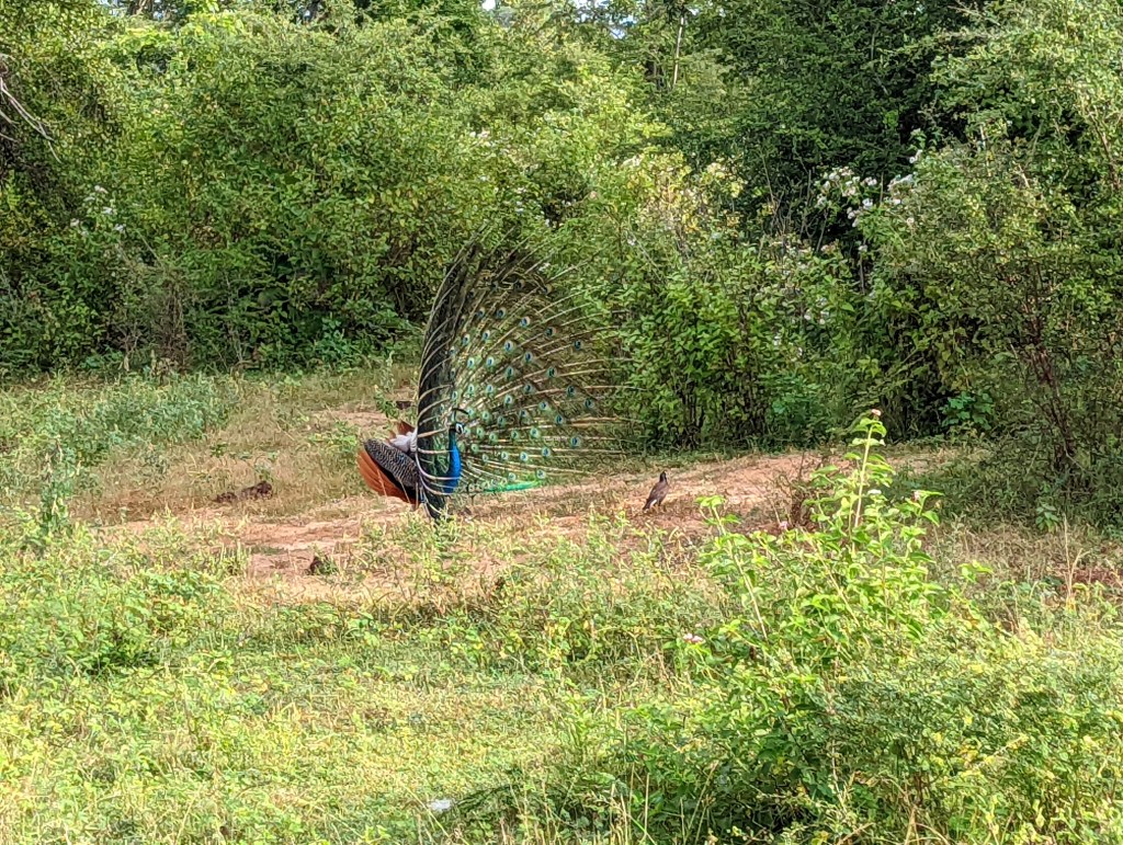 Das Tier, das wir am öftesten gesehen haben, war der Pfau. Wir haben sehr viele Männchen und Weibchen gesehen. Am Anfang in der Früh sind sie noch am Baum gesessen und etwas später dann herunten auf dem Boden und wir haben auch ein paar Mal gesehen wie das Männchen seine Federn aufgestellt und ein Rad geschlagen hat – das sieht sehr beeindruckend aus. Einmal ist der Fahrer auch einfach stehengeblieben und hat uns gefragt ob wir Pfauen-Federn wollen, weil welche auf dem Weg gelegen sind. Das war sehr nett von ihm.
