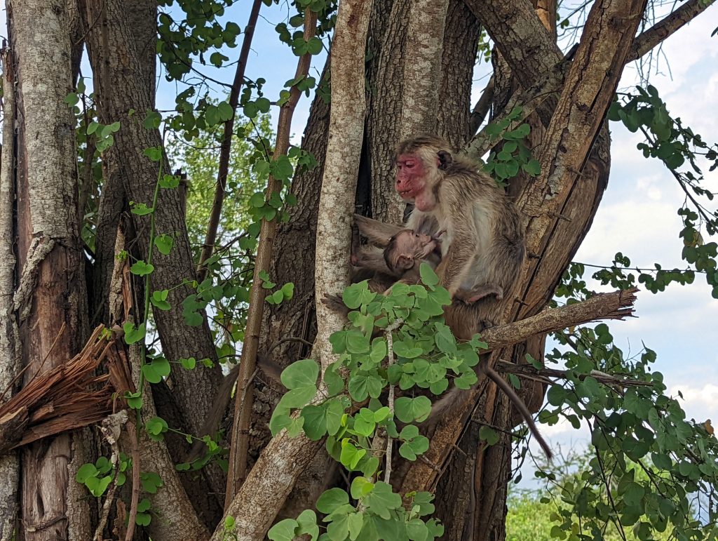 Ziemlich am Schluss unserer Safari haben wir noch eine richtig große Gruppe von Affen gesehen. Die waren überhaupt nicht scheu und einer wollte sogar zu uns rauf ins Auto – die wissen genau, dass manche Touristen Obst dabei haben. Am beeindruckendsten fand ich jedoch das nur wenige Wochen alte Baby, das bei seiner Mama getrunken hat. Ich kann euch nicht sagen, wie süß das war. Und auch da waren wir bis auf 1 m nah, wir konnten es also wirklich gut beobachten.