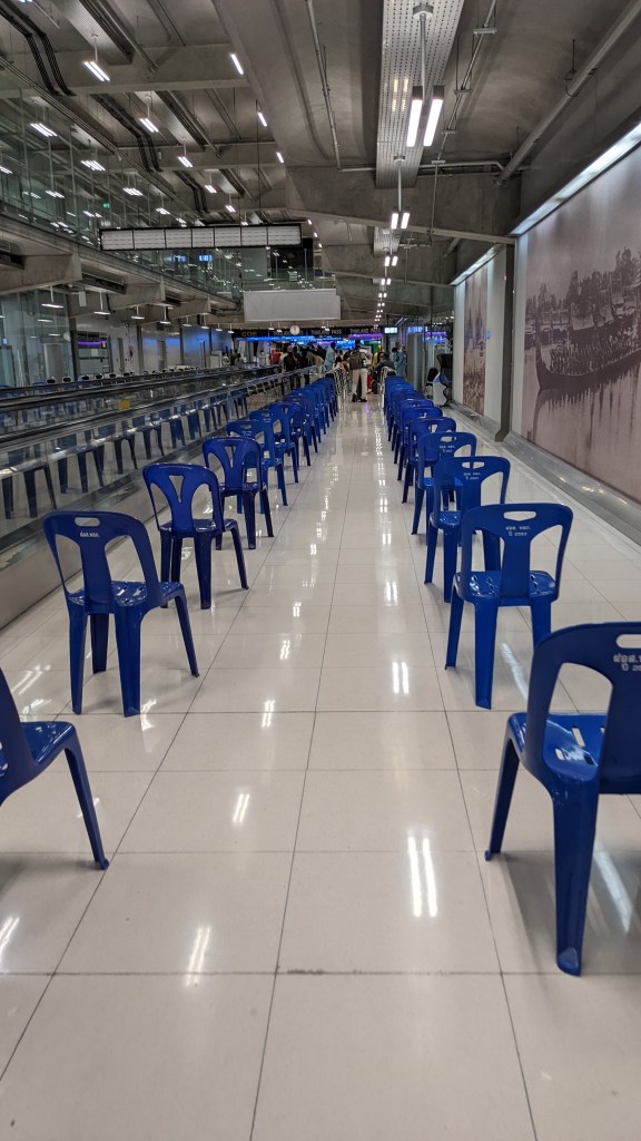 Nachdem beim Check-In und dem Flug alles geklappt hat, sind wir kurze Zeit später in Bangkok – der Hauptstadt von Thailand – gelandet. Ich bin vom Flugzeug ausgestiegen und hatte das Gefühl in einer völlig anderen Welt gelandet zu sein. Es war bei ca. 30 Grad angenehm warm, der Flughafen ist sehr sauber und dann nahm alles seinen Lauf. Das Flughafen-Personal ist sehr nett, freundlich und hilfsbereit und es gibt hier bei der Einreise eine sehr gut organisierte Struktur. Die Passagiere werden sofort eingeteilt wo sie langgehen müssen. Da wir „Test & Go“-Passagiere waren, mussten wir uns auf Sesseln sitzen, bis wir an der Reihe waren. Die Sesseln waren im Flughafenbereich mit genügend Abstand und in sauberer Reihenfolge aufgestellt. Schritt für Schritt kommt man von einer Person zur nächsten und muss die verschiedensten Dokumente vorweisen. Wie bereits erwähnt, alle sind äußerst freundlich und hilfsbereit – da fühlt man sich gleich auf Anhieb wohl im neuen Land. Als wir alles hergezeigt haben, ging es zur Gepäckausgabe. Direkt beim Ausgang wurden wir dann von einer Dame empfangen, die hat uns zu unserem Taxi gebracht und dieser Herr hat uns zum Hotel gefahren. Wir mussten uns um nichts kümmern, es war alles vorbereitet und komplett durchorganisiert! Da wir aus Sri Lanka kamen, wo alles eher drunter und drüber geht, war das für uns eine totale Umstellung, aber es war äußerst angenehm!