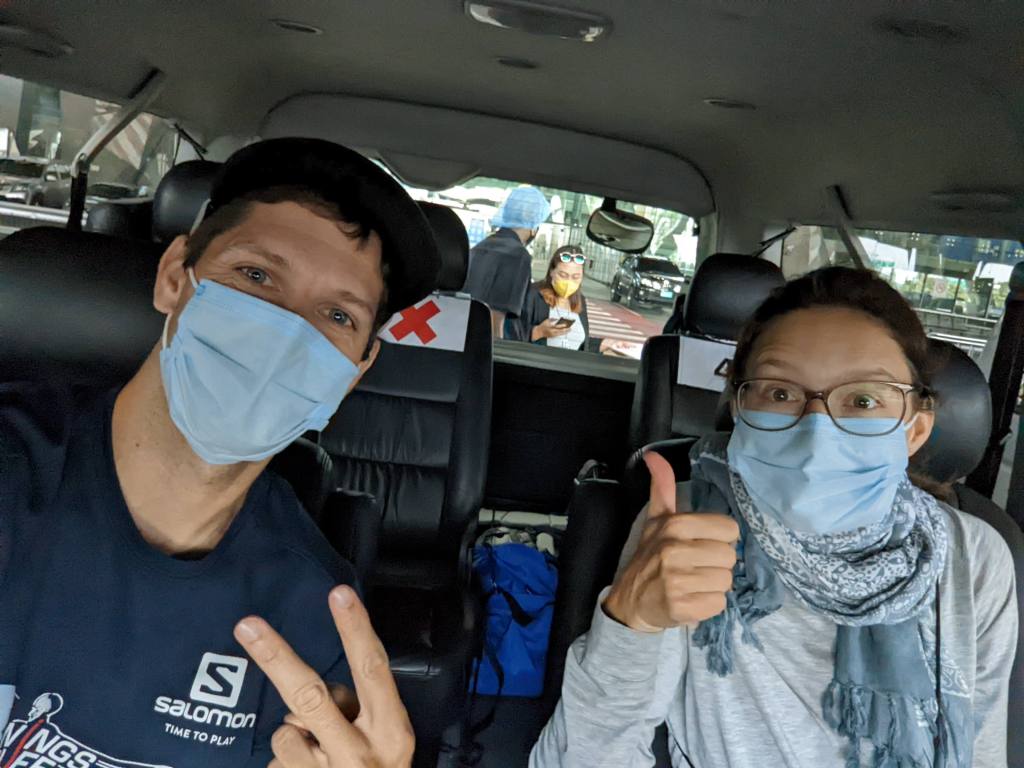 Alle Leute, die wir gesehen haben, waren mit Schutzkleidung ausgestattet. Es wird auch ständig alles desinfiziert. Bevor wir zum Beispiel ins Auto eingestiegen sind, wurden unsere Hände desinfiziert. Als die Rucksäcke in dem Kofferraum kamen, wurden diese auch komplett besprüht. Und vorne hat der Fahrer eine komplette Plastikfolie zwischen ihm und den Gästen hinten – wir konnten kein Wort mit ihm sprechen. Die Hygiene-Vorschriften werden also sehr gut eingehalten und umgesetzt. Hier mache ich mir also wirklich keine Sorgen, dass ich mich mit Corona infiziere.