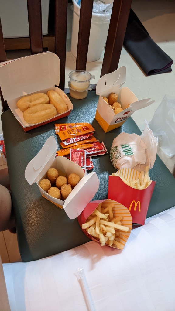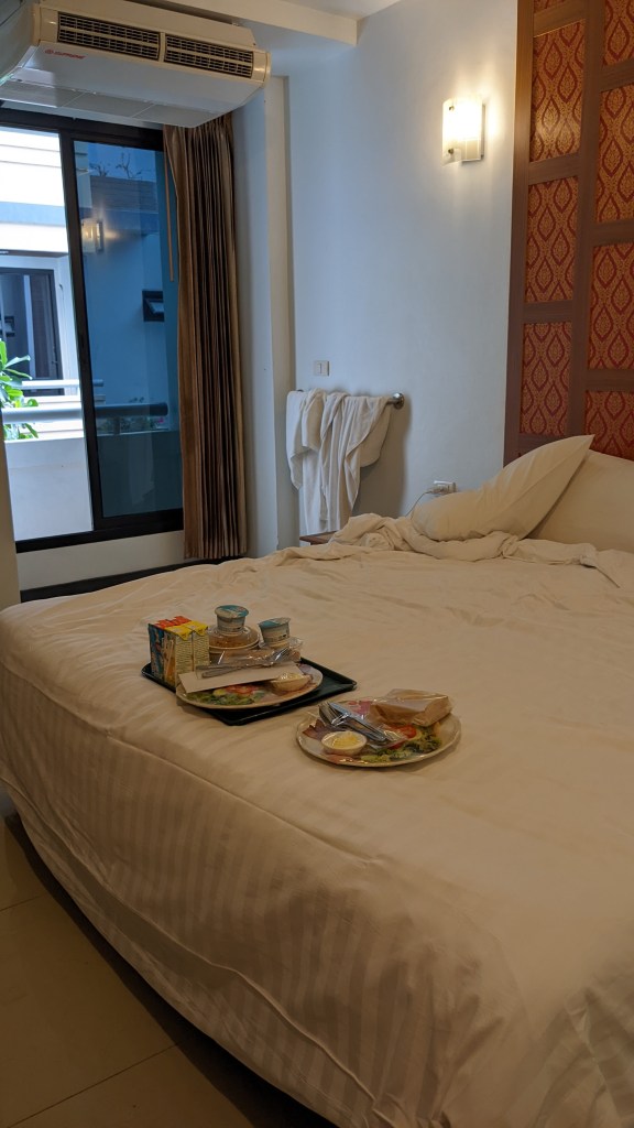 Im Hotel ist es mit der Organisation genau so weitergegangen, wie es am Flughafen begonnen hat. Wir mussten die Hände desinfizieren und dann Platz nehmen, bis die Krankenschwester da war. Noch bevor wir den Schlüssel für unser Zimmer bekamen, wurden wir getestet. Erst dann haben sie uns ins Zimmer gelassen. Und dort mussten wir bis zum Erhalt des Ergebnisses auch in Quarantäne bleiben. Das war für uns kein Problem. Da die letzte Nacht in Sri Lanka ziemlich kurz war, haben wir uns auf ein paar ruhige Stunden gefreut. Am Abend haben wir uns vom Mc Donalds etwas liefern lassen. Das wurde vom Hotelpersonal auch direkt in unser Zimmer gebracht, wir durften ja nicht raus. Das war dann etwas ganz besonderes für uns – der erste Tag in einer neuen Stadt ist bei uns normalerweise der Tag, wo wir gleich raus wollen und die Gegend um die Unterkunft kennen lernen und erkunden. Doch diesmal durften wir nicht und deshalb haben wir das Abendessen im Hotelzimmer genossen. Zuerst wollten wir bei einem heimischen Restaurant bestellen, doch da gab es zwei Hindernisse. Zum Ersten hat die Grab-App viele Namen nur auf thailändisch angezeigt und wir konnten nichts verstehen. Zum Zweiten haben wir dann teilweise verstanden was es heißen soll, aber wir wussten nicht so recht, ob es uns dann schmeckt. Normalerweise schauen wir uns das Essen auch immer gerne in „echt“ an, bevor wir bestellen. Besonders bei uns fremden Gerichten ist es sonst schwierig einschätzen zu können, ob man das mag oder nicht. Das alles wollten wir nicht riskieren und deshalb sind wir auf Nummer Sicher gegangen und haben bei Mc Donald’s bestellt. Der hat hier übrigens auch ganz andere Gerichte als bei uns daheim. Die Lieferung dauerte nicht lange, eine nette Dame hat an der Tür geklopft und dann haben wir alles genüsslich verspeist.