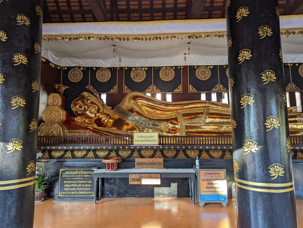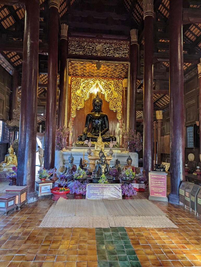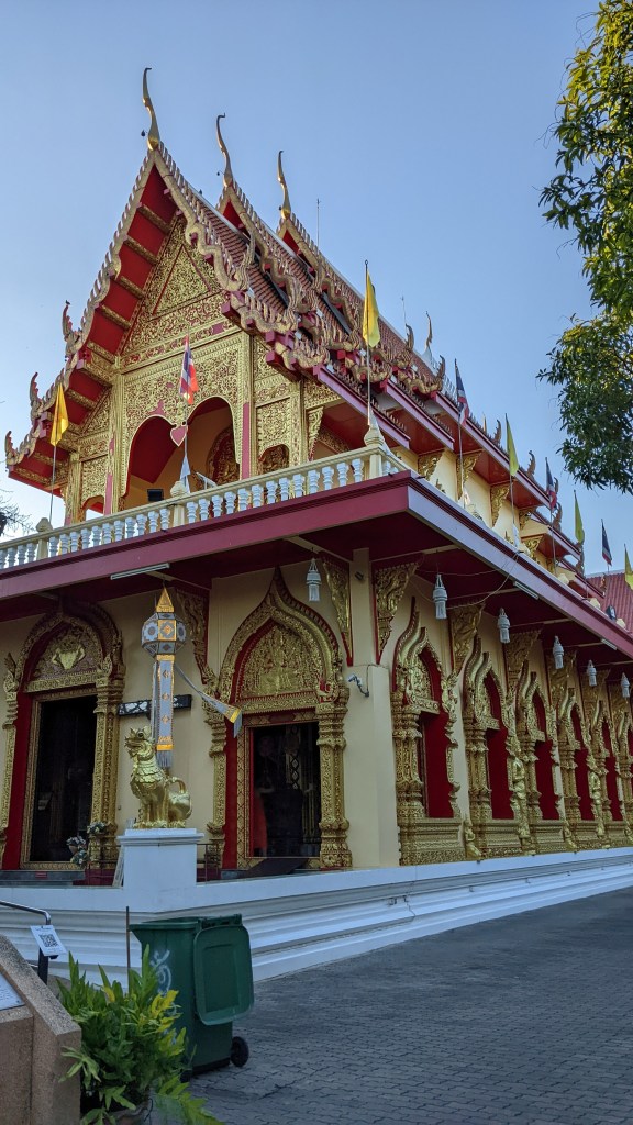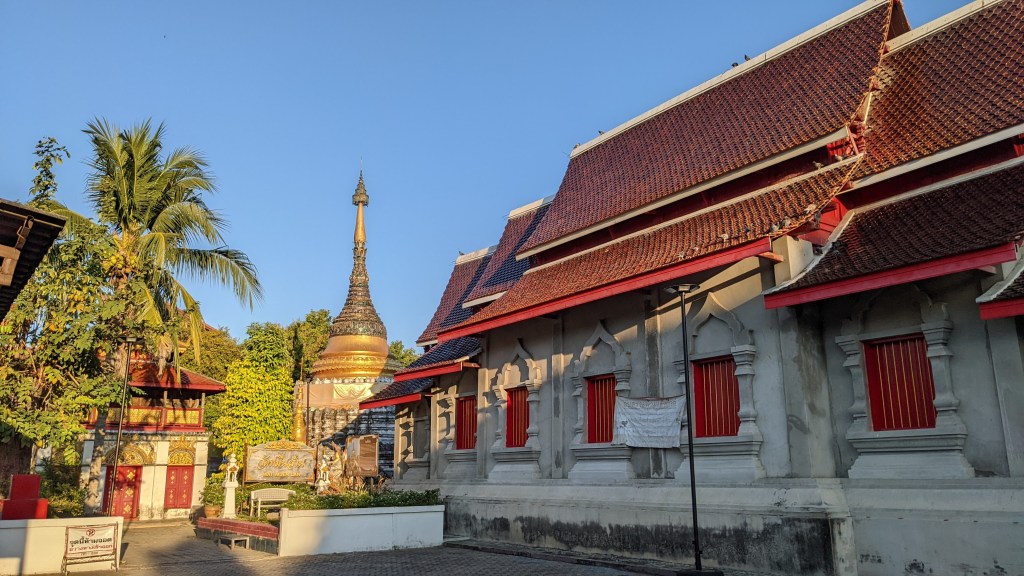 Als wir diese Straße durchgegangen sind, wurde uns sofort klar und bewusst, warum Chiang Mai „Stadt mit Hunderten von Tempeln“ genannt wird. Ich kann euch gar nicht sagen, wie viele Tempeln wir entlang dieser Straße auf engstem Raum gesehen haben. Einmal links, einmal rechts – wir sind immer hin- und hergelaufen und haben einfach gestaunt. Jeder einzelne davon ist sehr gut erhalten, schön geschmückt und verziert. Außerdem ist genauso wie in Bangkok sehr viel vergoldet. Während unserem Frühstück haben wir auch viele Mönche gesehen, die in der Früh zu diesen Tempeln gegangen sind. Da wir so früh unterwegs waren, hat sich noch nicht viel getan und die Stimmung bei der Ruhe und Stille war sehr besonders.