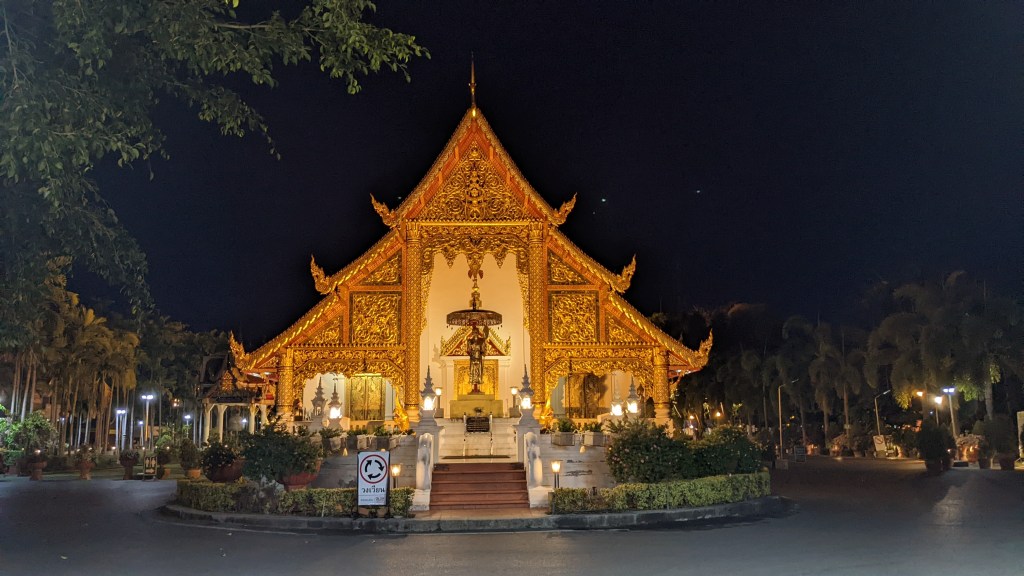 Am Abend haben wir uns aber nochmal aufgerafft und gingen Abendessen. Wir wollten auch die Stimmung in dieser kleinen und ruhigen Stadt bei Dunkelheit genießen. Außerdem habe ich mich auf die Tempel bei Nacht sehr gefreut. Wir sind nämlich davon ausgegangen, dass diese sicher schön beleuchtet sind. Leider hatten jedoch die meisten schon geschlossen. Doch der große Tempel am Ende der Walking Street, der Wat Phra Singh war schön beleuchtet. Am Vormittag haben wir den Tempel innen besichtigt und er hat uns sehr gut gefallen. Am Abend war leider abgesperrt, aber er war schön beleuchtet und wir konnten den Anblick trotzdem durch das Gitter genießen!