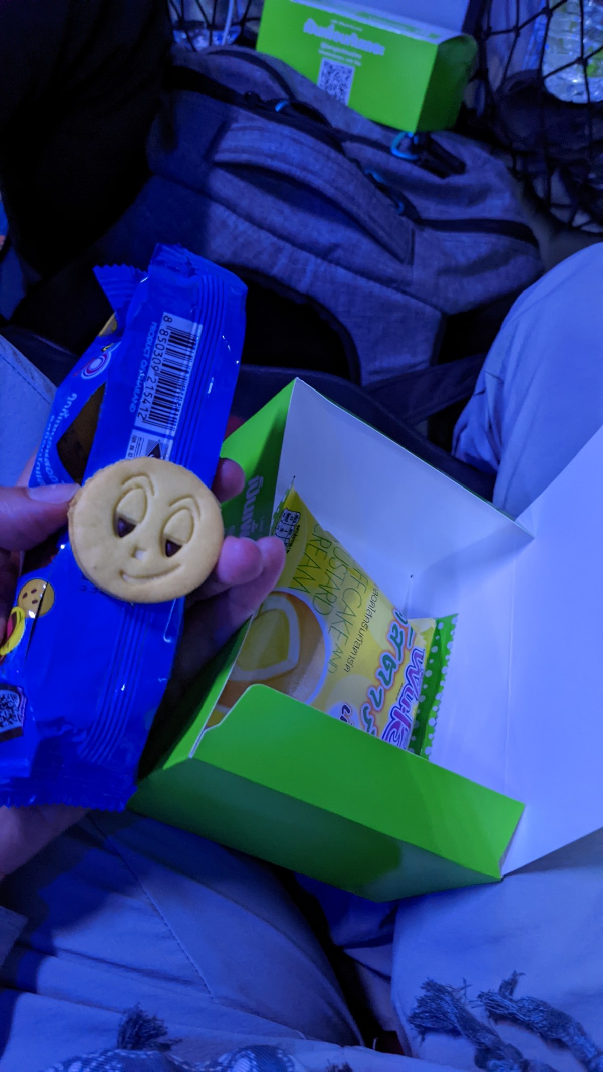Um 20:45 Uhr fuhren wir los. Wir konnten uns Bangkok noch bei Nacht ansehen. Jeder Passagier hat eine Flasche Wasser sowie eine kleine Packung Kekse und einen Eier-Kuchen bekommen. Decken wurden aufgrund von Corona nicht ausgeteilt. Wie uns das mitgeteilt wurde, war sehr witzig. Der Steward, der im Bus mitgefahren ist, hat nämlich sein Handy geschnappt und bei Google Translate den Text auf thailändisch eingegeben. Das übersetzte englische Ergebnis hat er uns dann auf seinem Smartphone gezeigt. Heutzutage kann man der Sprachbarriere also sehr leicht entgegenwirken – wir fanden das wirklich witzig. Im letzten Hotel in Bangkok ist es uns nämlich auch passiert. Da hat mich die Rezeptionistin in ihr Handy reinsprechen lassen, damit sie den Text auf thailändisch hat.