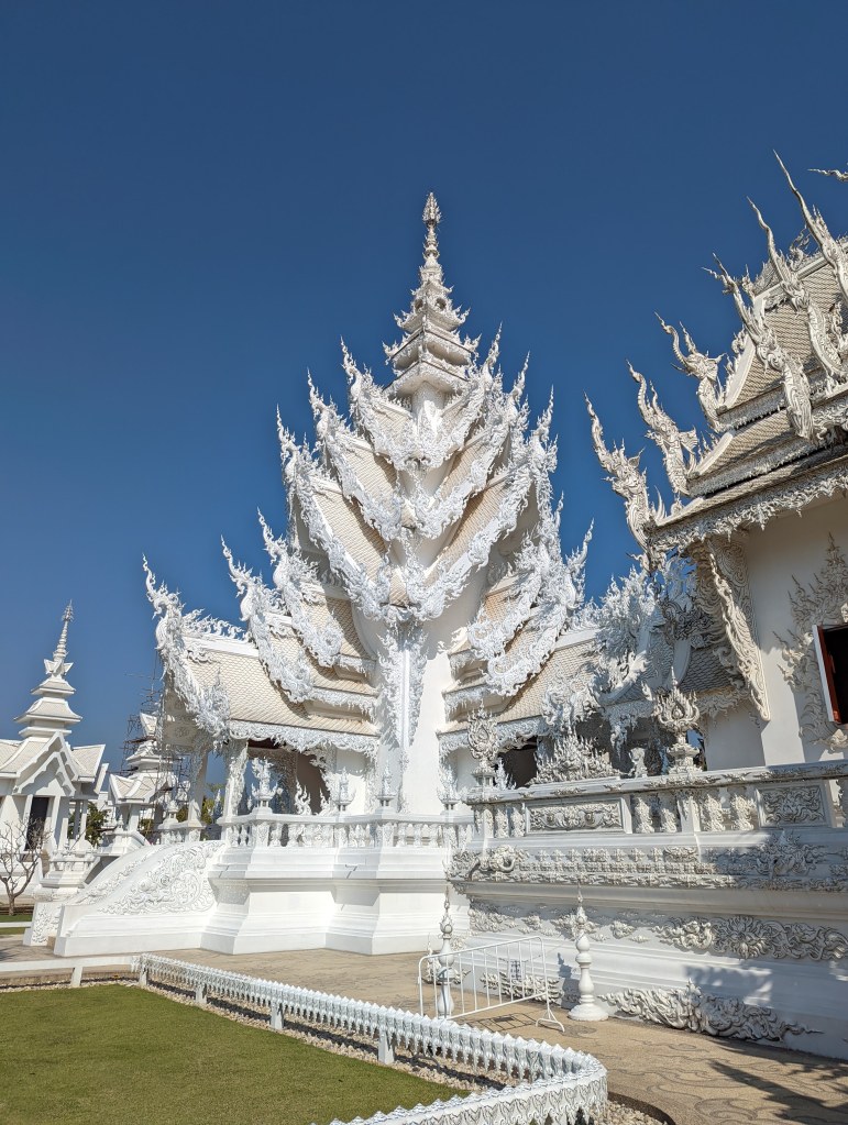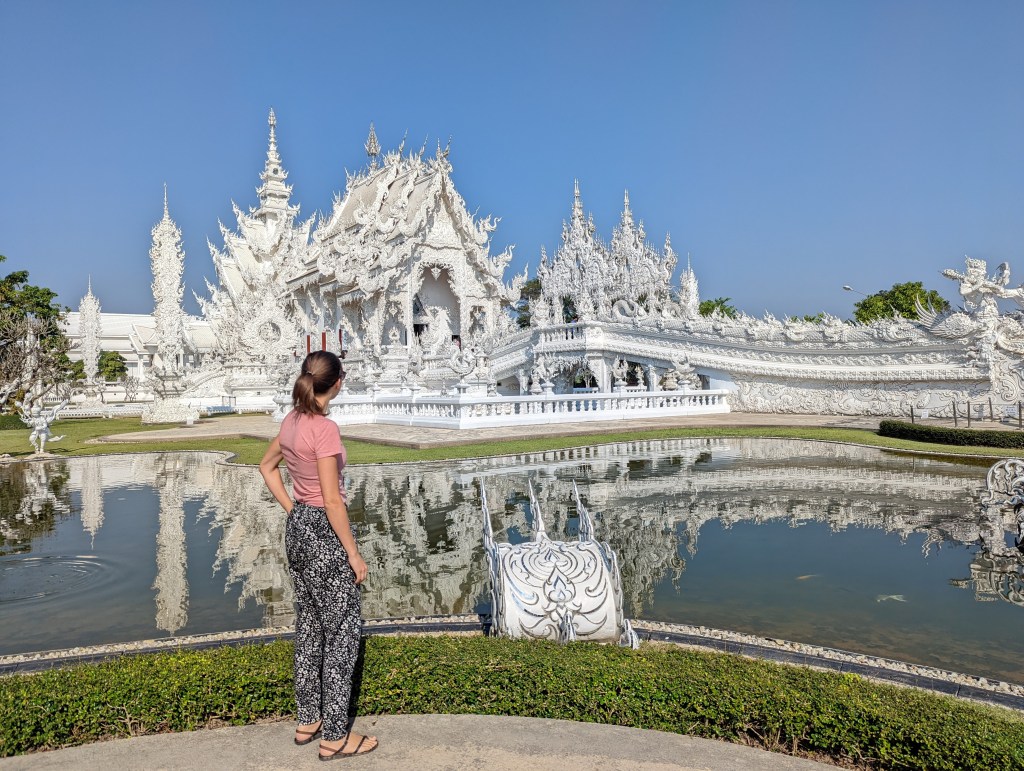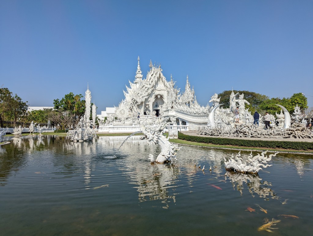 In Chiang Rai kann man eine besondere Sehenswürdigkeit besichtigen. Der Wat Rong Khun wird auch White Temple genannt. Dieser Tempel ist von der Form her den anderen Tempeln sehr ähnlich. Doch es gibt etwas, das ganz anders ist. Der Tempel ist in Weiß und Silber gehalten. Normalerweise schimmern die thailändischen Tempel in Gold und anderen Farben, doch dieser ist einfach nur Weiß und Silber. Die Verzierungen sind auch sehr spektakulär – es ist wieder alles mit sehr viel Liebe zum Detail gemacht worden. Ich war vom ersten Anblick an völlig verzaubert! Der Tempel ist wirklich so schön. Ich bin generell ein Fan von schlichter Schönheit und mag es, wenn es schlicht aber elegant ist. Dieser Tempel ist mein absoluter Favorit von allen Tempeln, die wir bisher gesehen haben. Wir haben zu dem Tempel auch recherchiert, die Farbe Weiß steht in Thailand eigentlich für Trauer. Deshalb sind die anderen Tempel auch Gold und Bunt. In Zusammenhang mit dem White Temple soll die Farbe Weiß jedoch die Reinheit von Buddha repräsentieren. Interessant ist auch, dass dieser Tempel ein privates Kunstwerk ist und nur mit Spenden finanziert wird. Bereits 1997 wurde mit dem Bau begonnen und für 2070 wird die komplette Fertigstellung geschätzt. Es wird wahrscheinlich alles noch mehr verziert, der Tempel ist aber bereits jetzt ein absolutes Muss, wenn man in der Gegend ist.