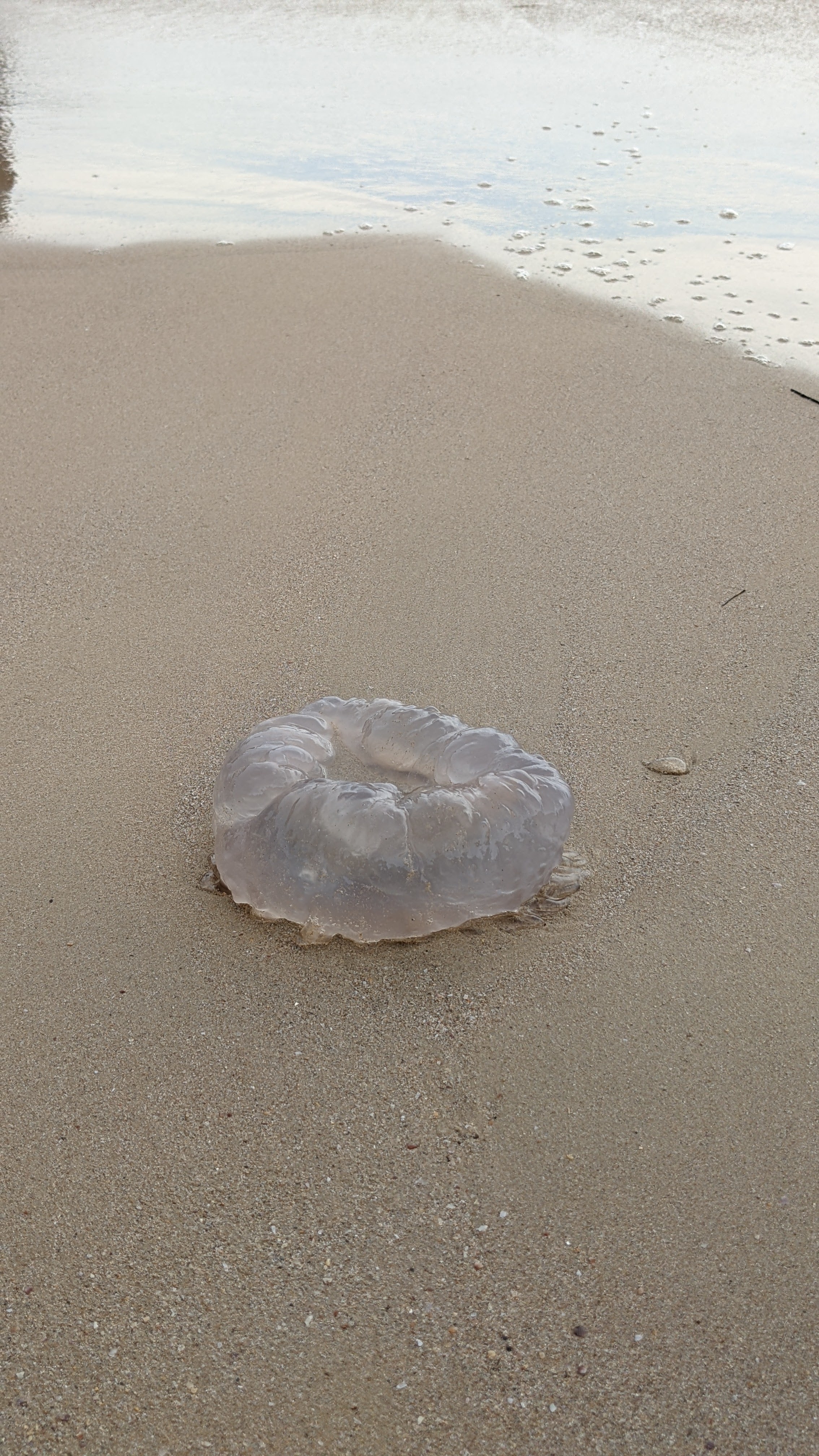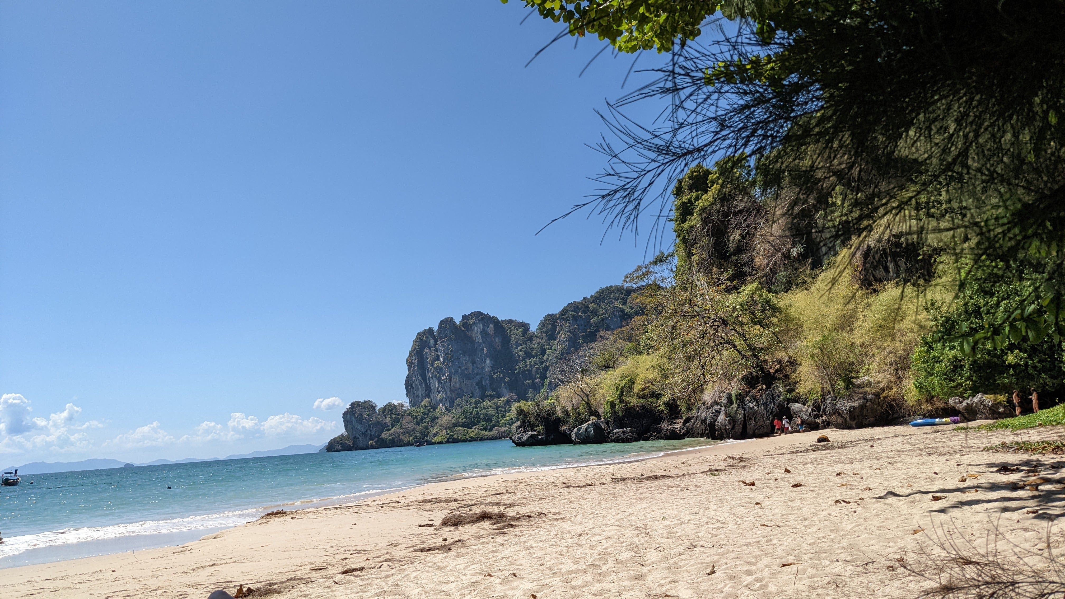 Um gleich einen ganz besonderen Strand besuchen zu können, sind wir zu Fuß zur nächsten Bucht gegangen. Diese Bucht ist vom Straßenverkehrsnetz durch die Felsen abgeschnitten. Man kann diesen Strand nur über das Meer oder dem so genannten Monkey Trail erreichen. Wir sind zu Fuß gegangen und über mehrere Stufen aus Holz und Bambus zu dem besonderen Ort gekommen. Der Strand ist umgeben von vielen hohen Felsen. Auch wenn man ins Meer hinausblickt sieht man links und rechts von der Bucht hohe Felsen. Der Anblick war sehr schön. Ich habe hier außerdem das erste Mal sehr große Quallen am Strand liegen sehen – so große hatte ich zuvor noch nie gesehen!