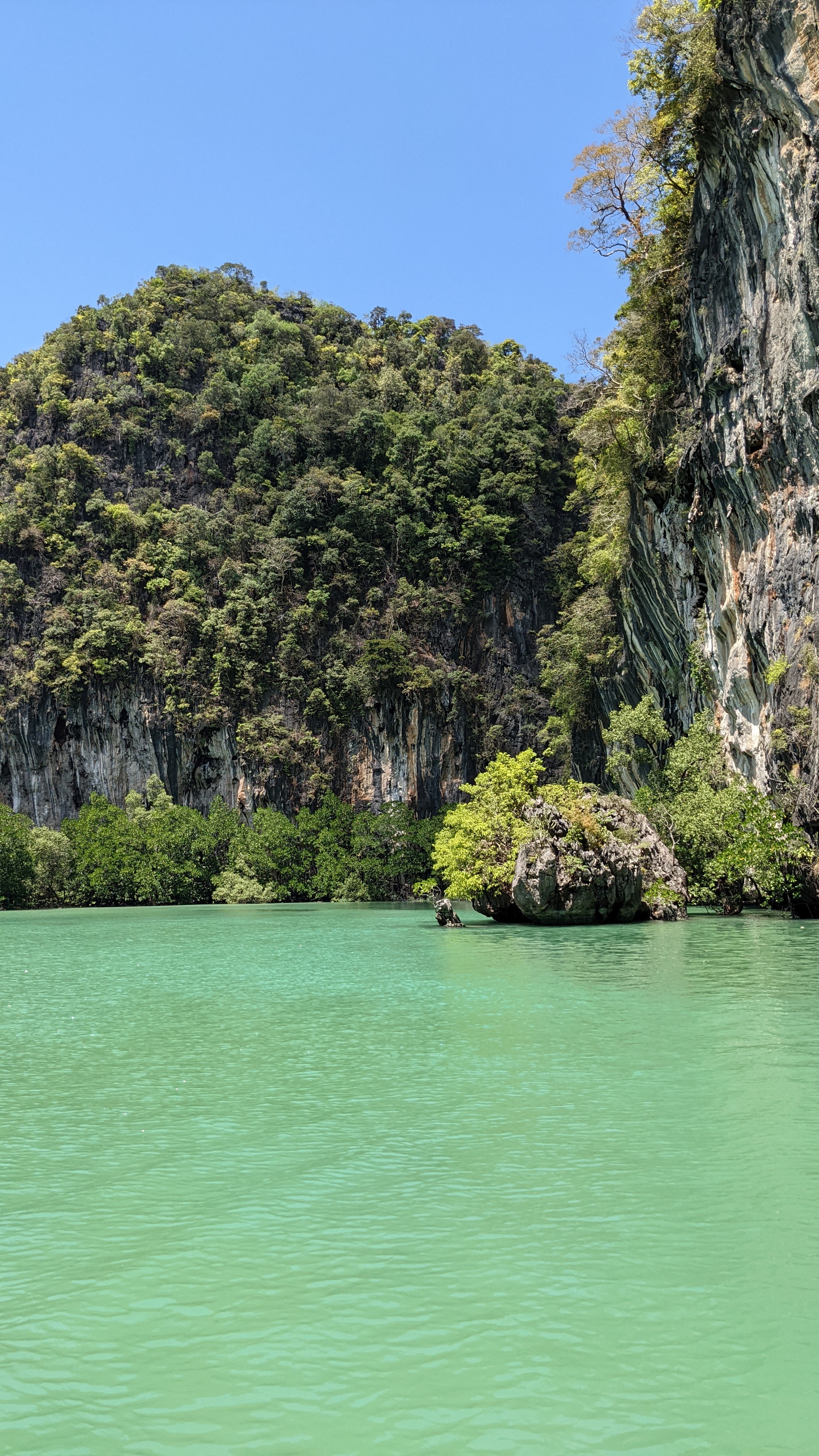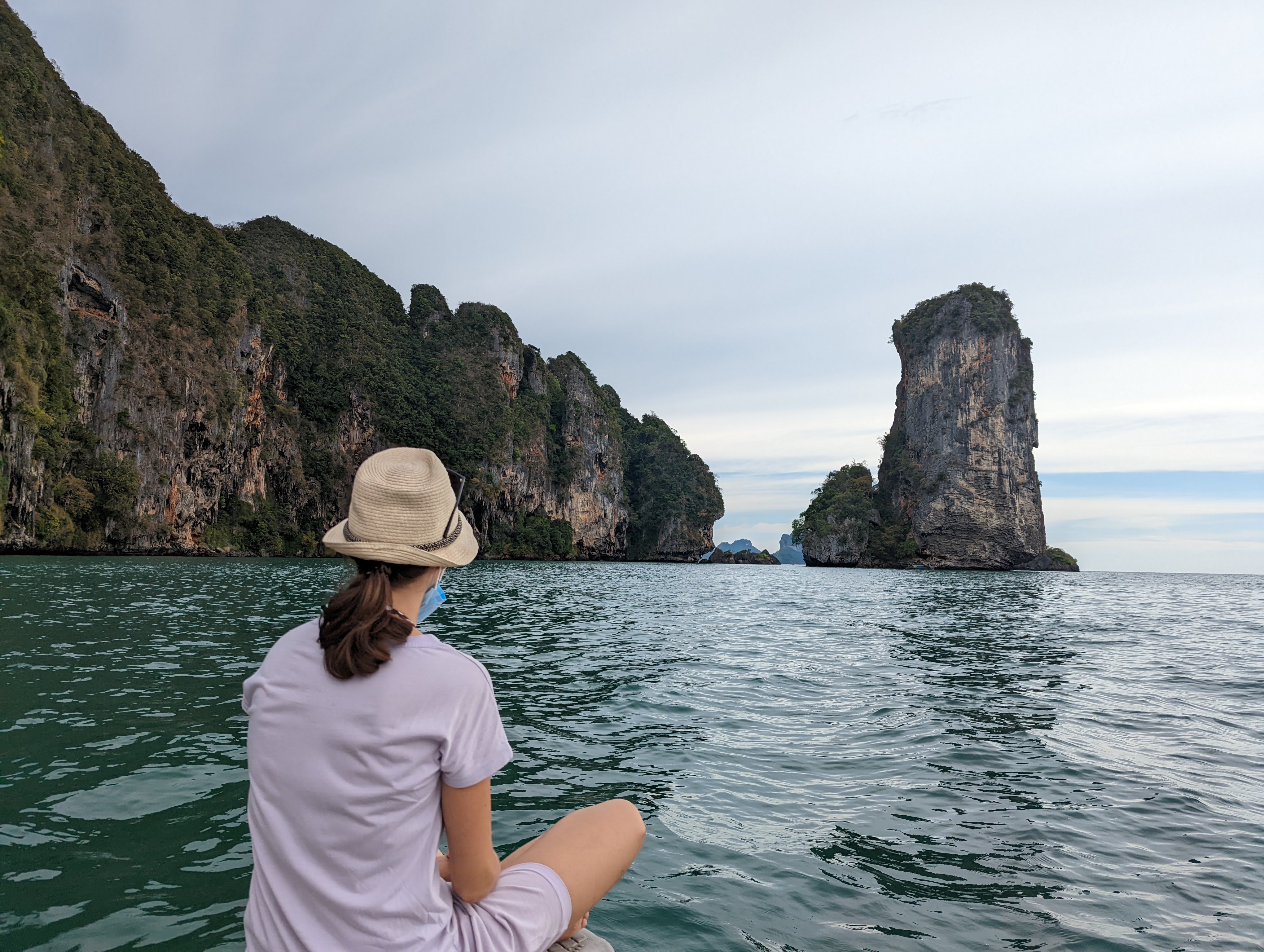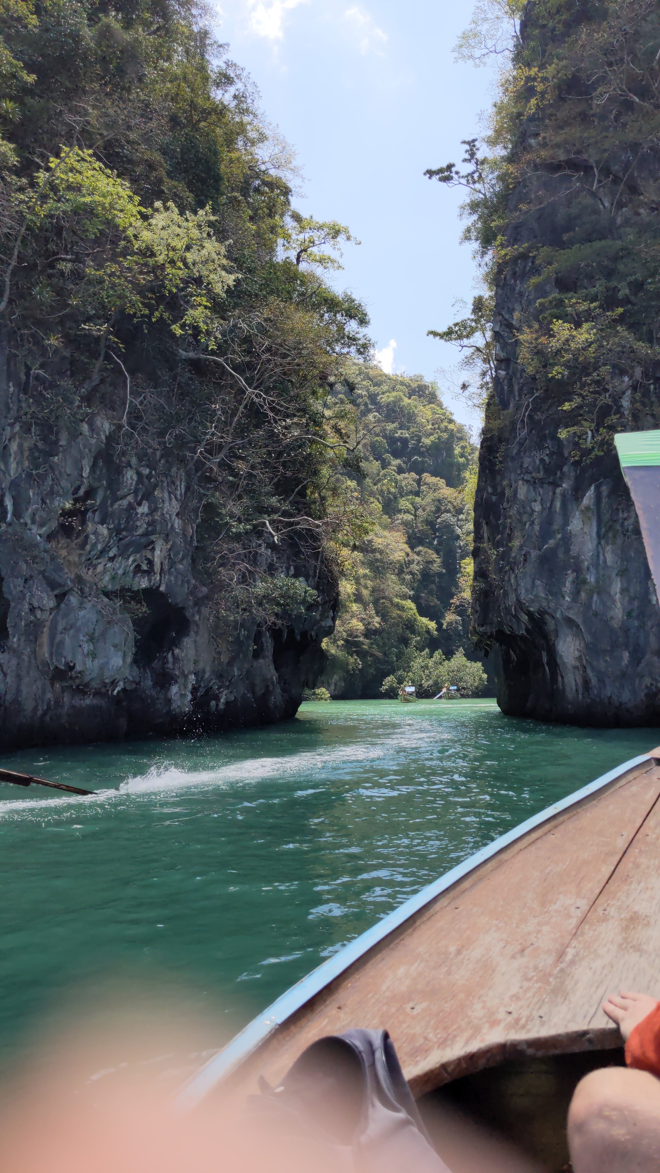 Danach fuhren wir in die Hong Lagoon. Diese Lagune konnten wir in der Früh nicht besuchen, da aufgrund vom Halbmond Ebbe war und wir nicht hineinfahren konnten. Als wir am Nachmittag dort ankamen, hat es aber funktioniert. Wir sind durch einen engen Spalt zwischen zwei sehr hohen Felsen gefahren und haben im Inneren eine Lichtung entdeckt. Fast rundherum waren nun hohe Felsen und wir standen mit unserem winzigen Boot mitten drinnen. Wir durften dort sogar vom Boot gehen und schwimmen. Das war wirklich ein tolles Erlebnis. Das witzigste war jedoch, dass es sehr seicht war. Sogar ich konnte da stehen – das war sehr cool.