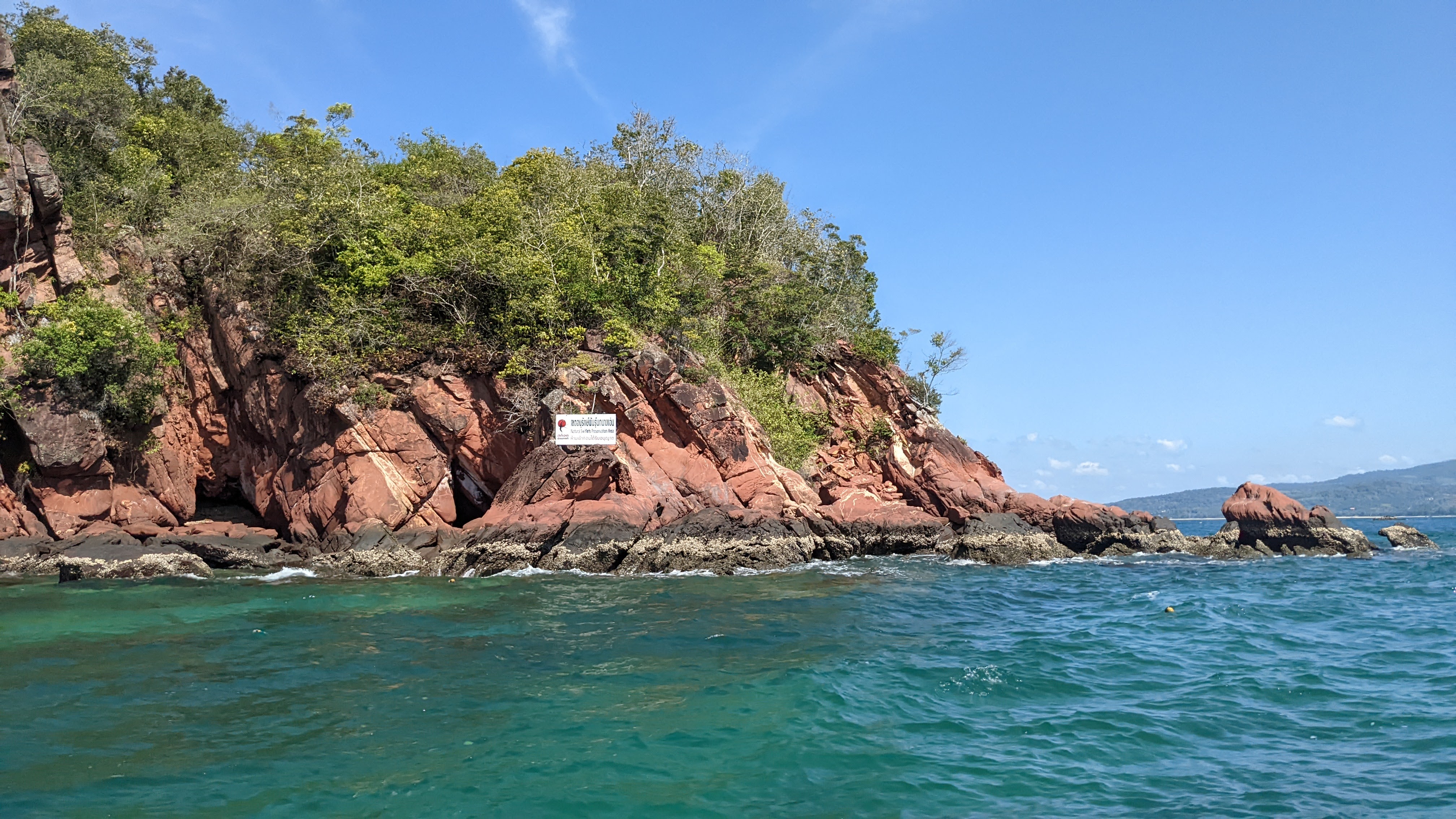 Unseren zweiten Tag in Ao Nang haben wir mit einer Insel-Hopping-Tour verbracht. Wir sind auf ein Longtail-Boot gestiegen und haben insgesamt 3 Inseln besucht. Der erste Stopp war bei der Insel Ko Daeng. Diese Insel hat keinen Strand, wir konnten daher nur direkt vom Boot ins Meer. Hier war der Stopp zum Schnorcheln. Wir waren auch schnorcheln, aber nur sehr kurz. Es waren hier nämlich sehr viele Quallen. Generell haben wir schon während der Fahrt ganz viele große rosa Quallen gesehen. Es waren auch viele Boote unterwegs, die diese Quallen gefangen haben. Laut unserem Bootsführer werden die verkauft und anschließend verspeist – so eine Qualle zu probieren, reizt mich aber nicht. Wir sind uns auch nicht sicher, ob es die Wahrheit war. Denn es hat sicher auch mit dem Tourismus zu tun, dass hier nicht so viele Quallen sein sollen. Wir hatten auf alle Fälle Angst und wollten die Tentakeln nicht berühren, daher sind wir wieder aufs Boot und weitergefahren.