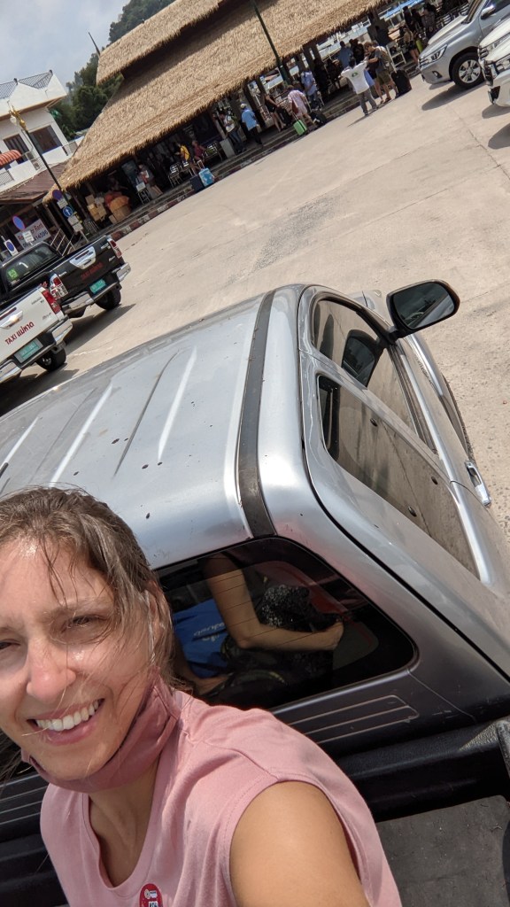 Direkt am Pier sind wir von einem Taxifahrer abgeholt worden. Diesen Service hat die Unterkunft kostenlos angeboten. Wir sind das erste Mal mit einem Pick-Up gefahren, wo auf der Ladefläche einfach zwei Bänke montiert wurden. Zum Aufsteigen hat uns der Fahrer ein Stockerl hingestellt und während der Fahrt waren unsere Köpfe und Oberkörper über dem Dach des Autos – so bin ich noch nie auf einem Pick-up gesessen.