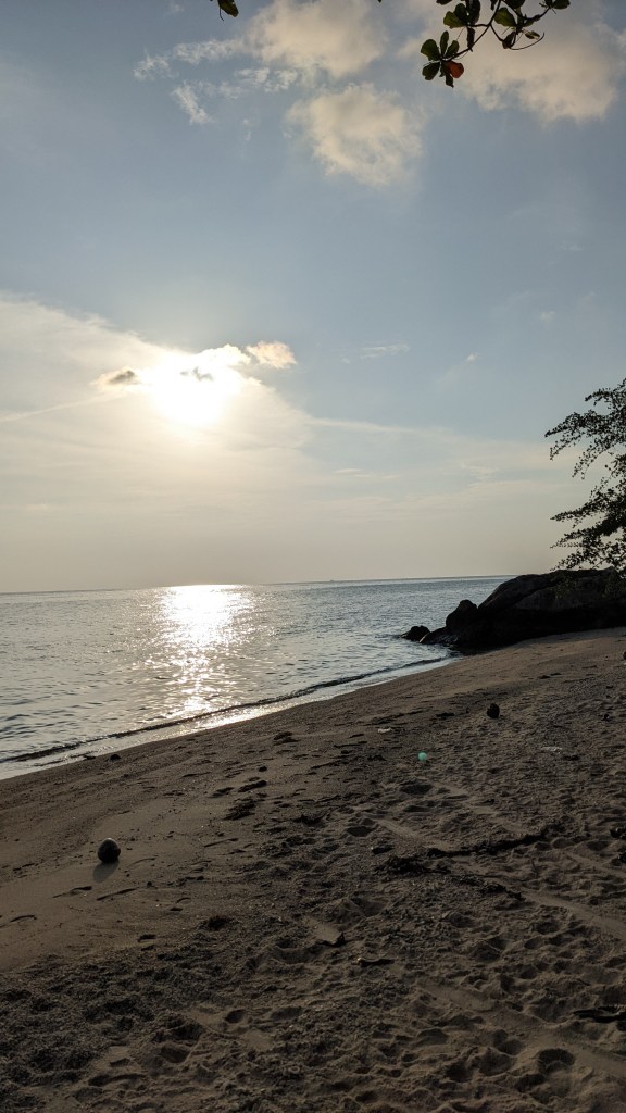 Am nächsten Tag gingen wir noch vor dem Frühstück schnorcheln. Wir fuhren wieder zu dem June Juea Bay. Wir waren ganz alleine dort – niemand sonst war am Strand und auch niemand sonst war im Meer. In der Früh ist das Wasser sehr klar und man sieht die Fische besonders gut. Wir haben die Zweisamkeit richtig genossen. Diesmal hatte ich ein besonderes Glück, ich habe nämlich einen Hai gesehen, den Schwarzspitzen-Riffhai.