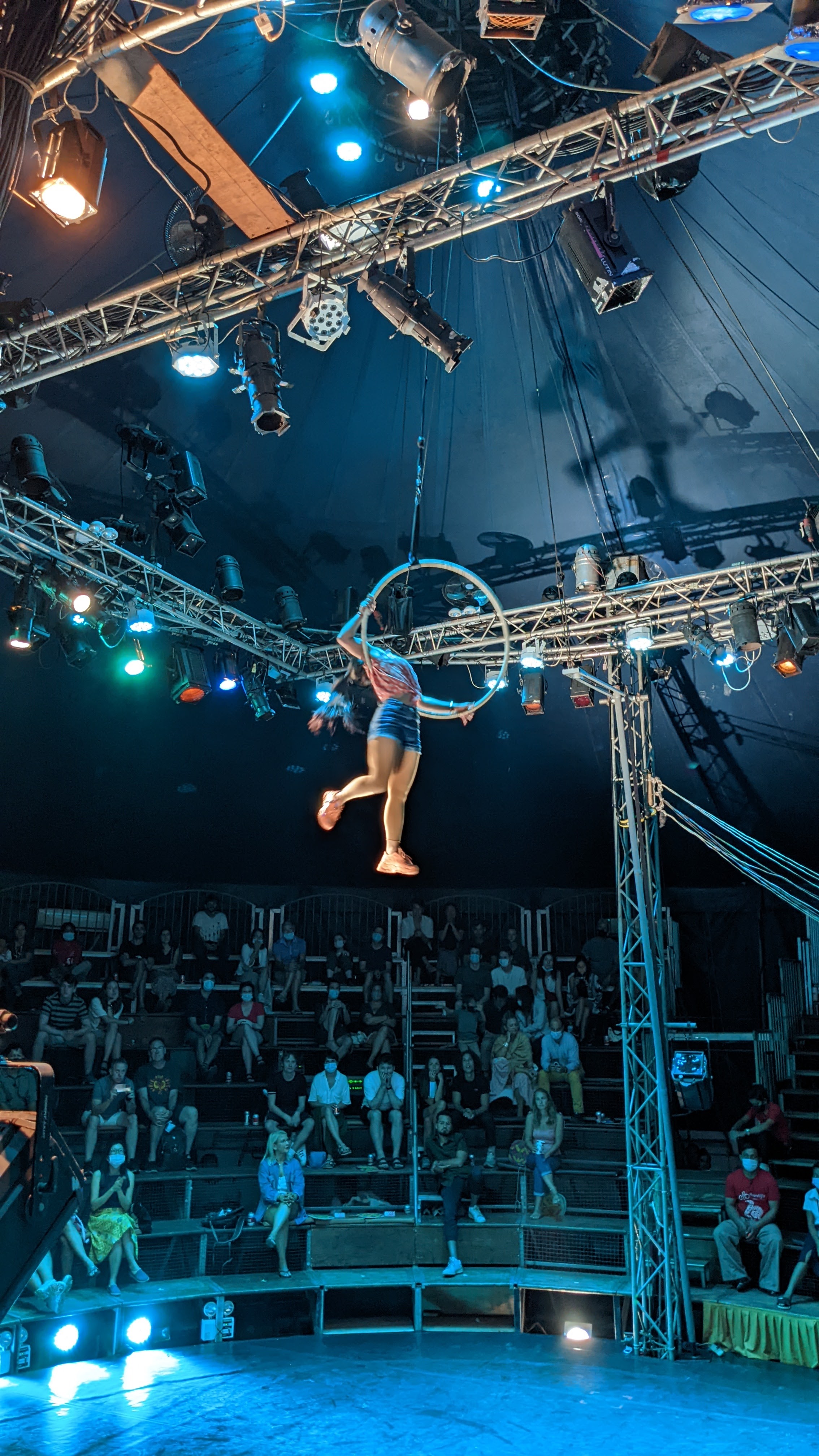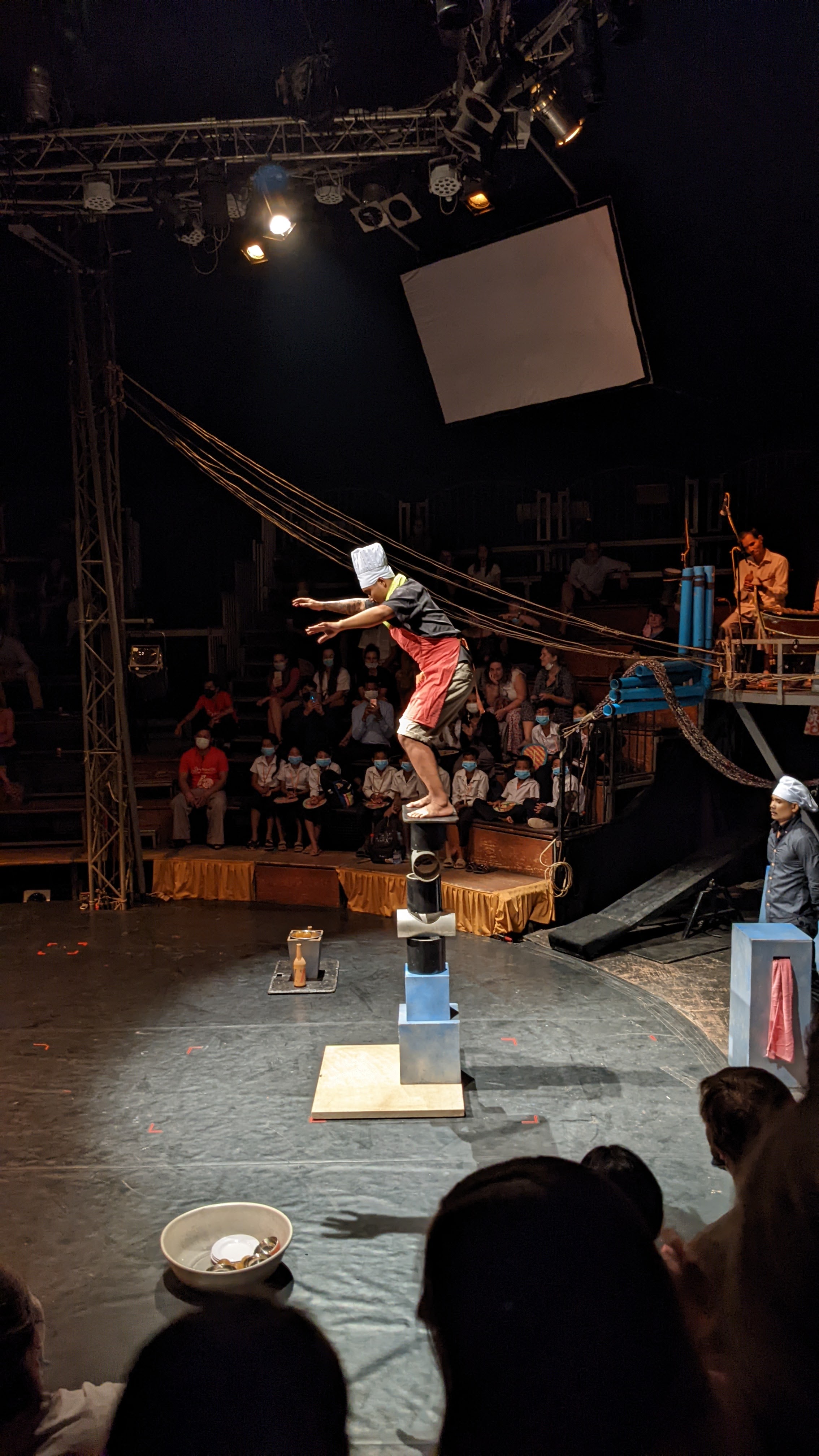 Am Abend sind wir in den Zirkus gegangen. Dieser Zirkus nennt sich „Phare, The Cambodian Circus“. Über diesen Zirkus habe ich im Internet nur zufällig gelesen, ich bin aber sehr froh, dass wir dort waren. Es handelt sich hierbei nämlich um ein ganz besonderes Projekt. Die Institution wurde im Jahr 1994 von 9 jungen Männern, die vom Flüchtlingslager nach dem Regime der Roten Khmer nach Hause kamen, gegründet. (Über die Zeit des Regimes der Roten Khmer werde ich noch schreiben, wenn wir in Phom Phen in dem furchtbaren Museum waren.) Sie wurden während dieser Zeit von einem Kunstlehrer, der Zeichenunterricht als Therapie nutzte, sehr unterstützt und wollten diese neue Fähigkeit mit den armen, sozial benachteiligten und problematischen Jugendlichen teilen. Es wurde zuerst eine Kunstschule und öffentliche Schule eröffnet, die kostenlose Bildung anbietet. Es kamen dann eine Musik- und Theater- sowie schlussendlich eine Zirkusschule dazu. Heute sind mehr als 1.200 Kinder in der öffentlichen Schule und 500 in den alternativen Schulen.