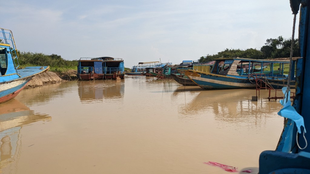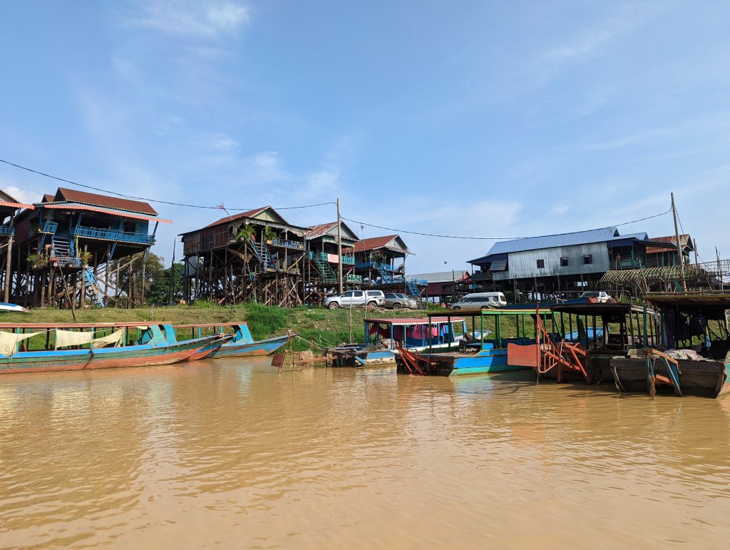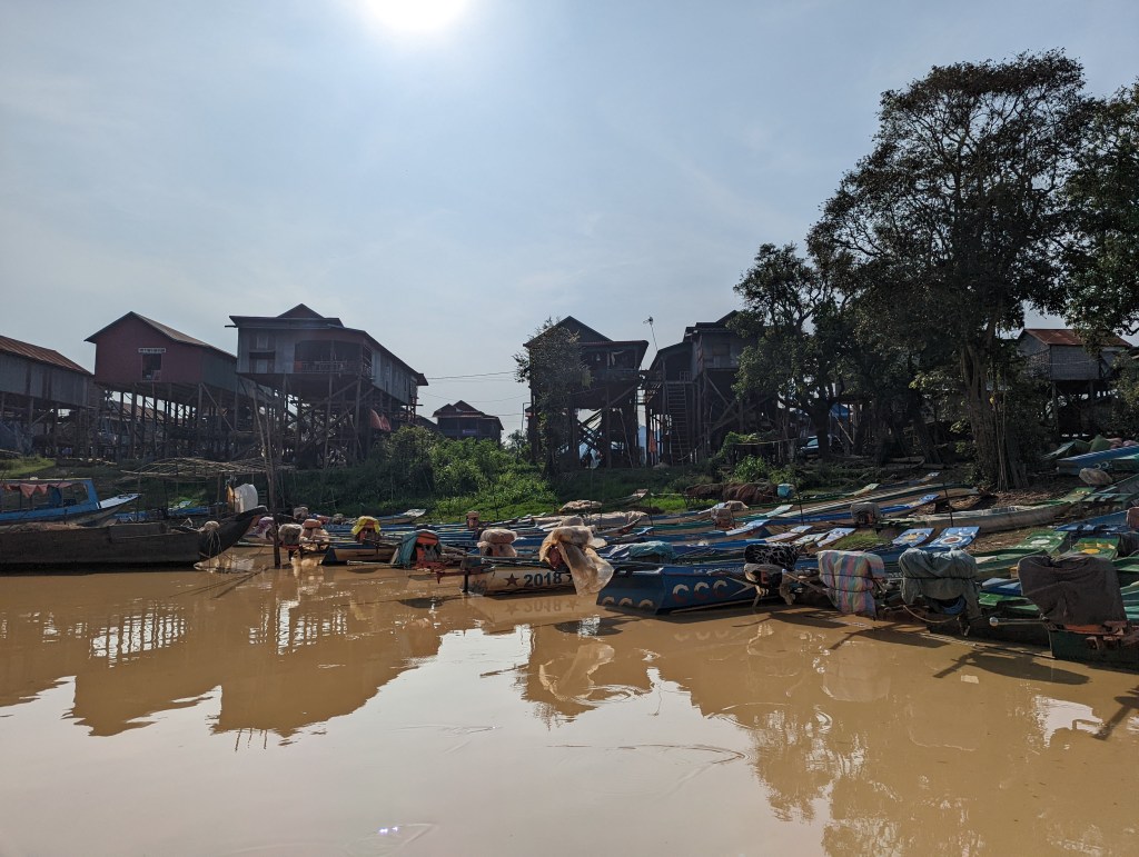 Kambodscha hat auch den größten See von Südostasien. Dieser nennt sich Tonle Sap. Abhängig von der Jahreszeit (Trocken- oder Regenzeit) hat er eine Größe von 2.600 km² bis zu 10.400 km². Im Moment ist die Trockenzeit und der See hat teilweise nur eine Tiefe von 1 Meter – wir konnten sehen, wie Menschen mitten im See gestanden sind. Zur Regenzeit bekommt der See eine Tiefe von bis zu 14 Meter. Dieses Naturschauspiele finde ich wieder einmal sehr beeindruckend. Wir waren dann auch noch in einem schwimmenden Dorf zu Besuch. Da es aktuell trocken ist, konnten wir durch die Straßen gehen und die Pfähle unter den Häusern sehen. In der Regenzeit ist hier jedoch alles überschwemmt. Die Kinder müssen direkt von den Häusern mit dem Boot zur Schule gebracht werden. Die ganze Infrastruktur verlagert sich auf den See. Es ist sehr beeindruckend, dass die Menschen hier in diesen Häusern leben. Unser Führer hat uns auch erzählt, dass die Regierung den Menschen vorgeschlagen hätte den See zu verlassen, um woanders zu wohnen. Doch dies hat die Bevölkerung abgelehnt. Die Menschen leben hier noch sehr ursprünglich, sie müssen jeden Tag frischen Fisch aus dem See holen, weil es keine Elektrizität gibt. Die Kinder waren sehr freundlich und haben uns gewinkt. Die Erwachsenen strahlten meiner Meinung nach Unzufriedenheit aus. Für uns war es trotzdem ein tolles Erlebnis den Ort Kampong Phlouk aus der Nähe betrachten zu können.