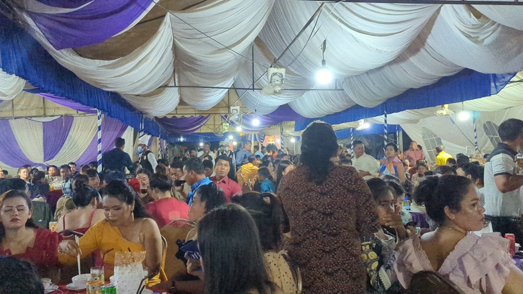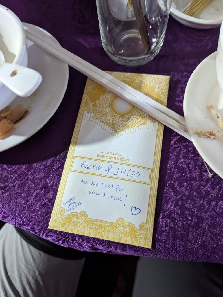 Eine kambodschanische Hochzeit dauert 2 Tage. Am ersten Tag findet die Zeremonie mit einem Mönch statt und am zweiten Tag findet die Party statt. Zu so einer Hochzeit kommen immer um die 700 Personen. Das Brautpaar lädt die meisten Leute ein, es ist aber auch üblich, dass man einfach kommt. Bei der Hochzeit, die wir besuchten, waren ungefähr 800 Personen. Du kannst dir nicht vorstellen, wie es da zugegangen ist. Vor dem Wohnhaus ist ein riesengroßes Zelt aufgebaut oder dort standen 80 Tische, auf denen ca. 10 Personen Platz nahmen. Bevor man die Hochzeit betritt und durch das Blumentor am Eingang geht, wird ein Foto gemacht. Dann sucht man sich einen Platz zum Sitzen. Getränke stehen am Tisch und sobald ein Tisch voll ist, wird das Essen serviert. In der Mitte vom Tisch ist eine große runde Platte auf der verschiedene Vor- und Hauptspeisen serviert werden. Jeder nimmt sich dann etwas heraus und es wird gespeist. Das Essen war sehr lecker! Zum Trinken gab es großteils Bier aber auch viele Softdrinks – alles in Dosen. Beim letzten Gang sind kleine Kuverts für die Hochzeitsgäste dabei. In diese Kuverts gibt jeder das Geld und schreibt seinen Namen darauf. Wenn man die Hochzeit verlässt, schmeißt man dieses Kuvert dann in eine große Box aus Herz. Das ist das Geschenk für das Brautpaar.