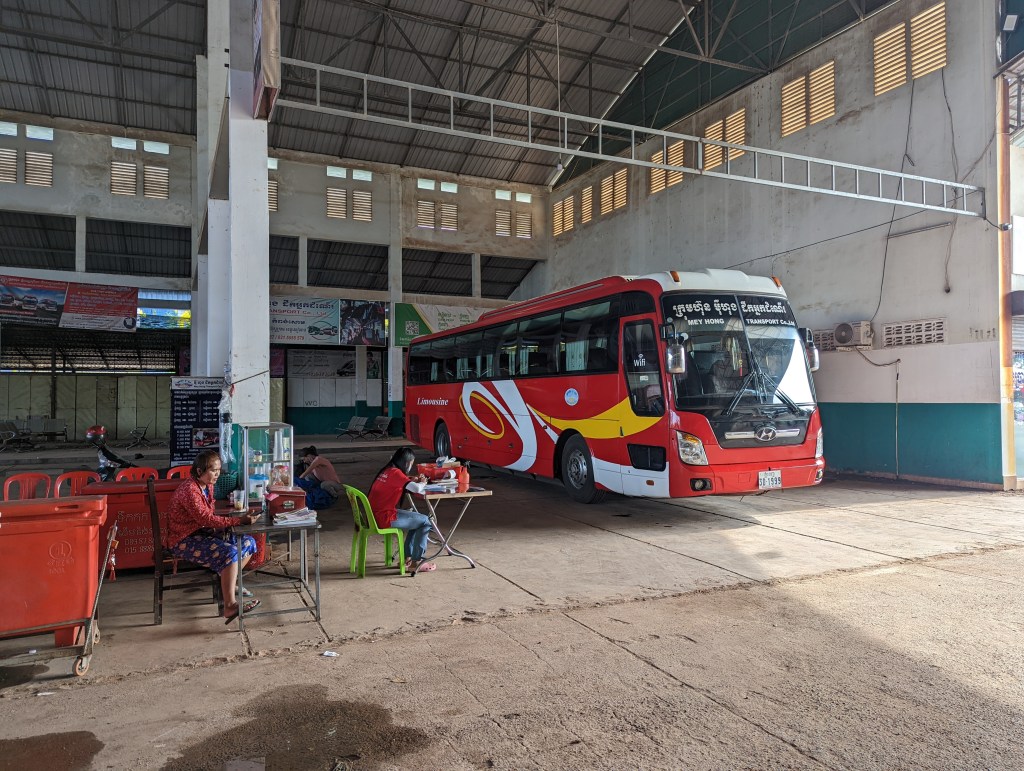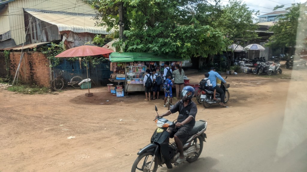 Die Busfahrt von Siem Reap nach Phnom Penh dauerte ca. 6 Stunden und war sehr angenehm. Da wir am Tag fuhren, konnten wir vom Land sehr viel sehen. Die Natur ist sehr beeindruckend, das ganze Land ist ziemlich flach und man sieht viele Reisfelder und Palmen. Leider sieht man aber auch sehr viel Müll neben den Straßen – dies ist in den Städten nicht so tragisch aber am Land wirklich extrem. Wir haben auch viele Häuser von den Einheimischen gesehen. Es gibt hier wirklich viele arme Leute, die nur in kleinen Hütten hausen.
