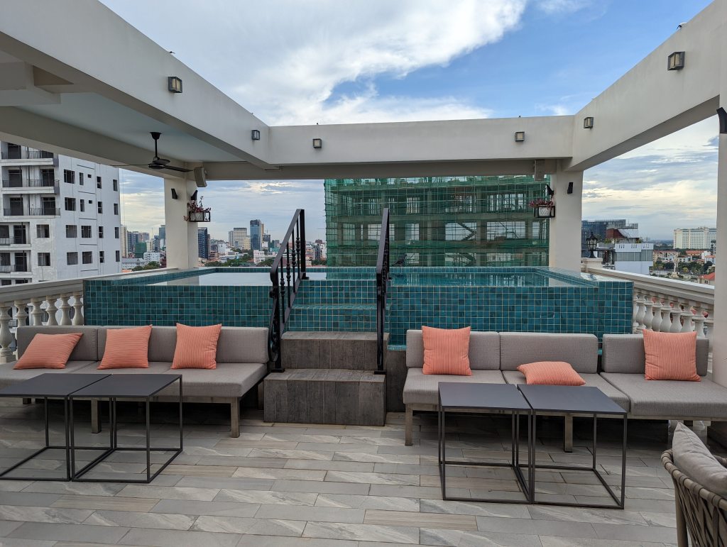 Als wir in der Hauptstadt angekommen sind, wurden wir richtig geflasht. Phnom Penh ist riesengroß. Es gibt viele Hochhäuser und der Verkehr ist sehr lebendig. Es ist eine komplett andere Welt, in die wir nun eintauchen. Ein Tuktuk, das hier in Kambodscha übrigens Rikshaw genannt wird, brachte uns zum Hotel. Diesmal haben wir ein Zimmer im 8. Stock und eine Dachterrasse mit Pool. Dank Corona sind solche Unterkünfte aktuell auch für Backpacker im Budget – das ist sehr schön, wir freuen uns und fühlen uns richtig wohl hier.
