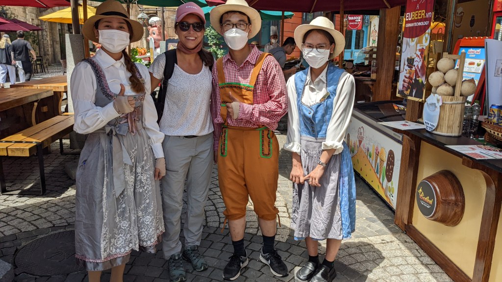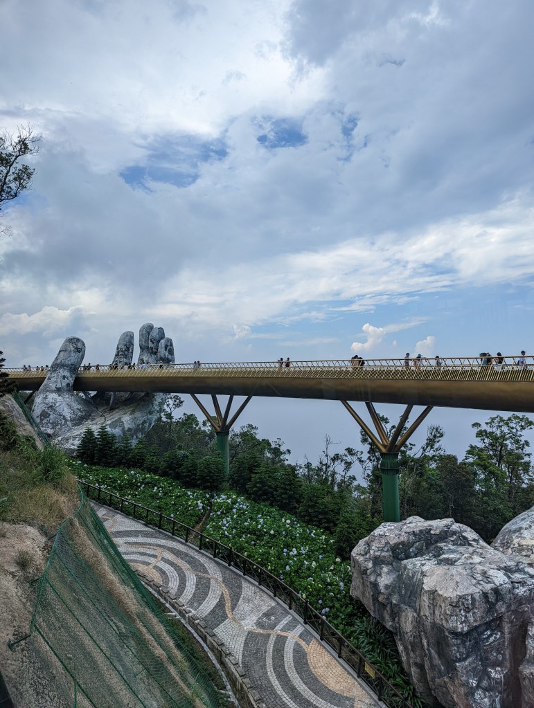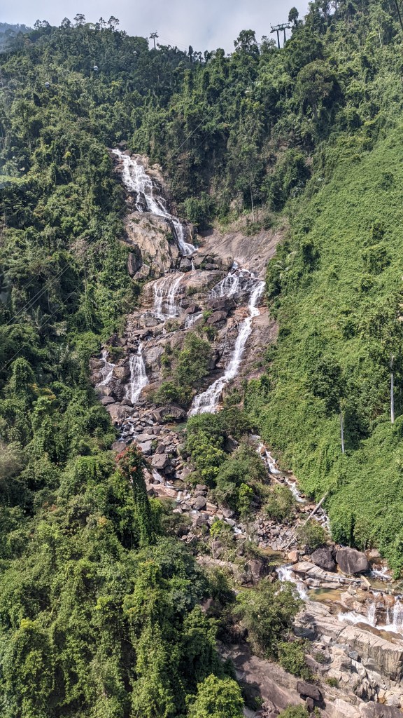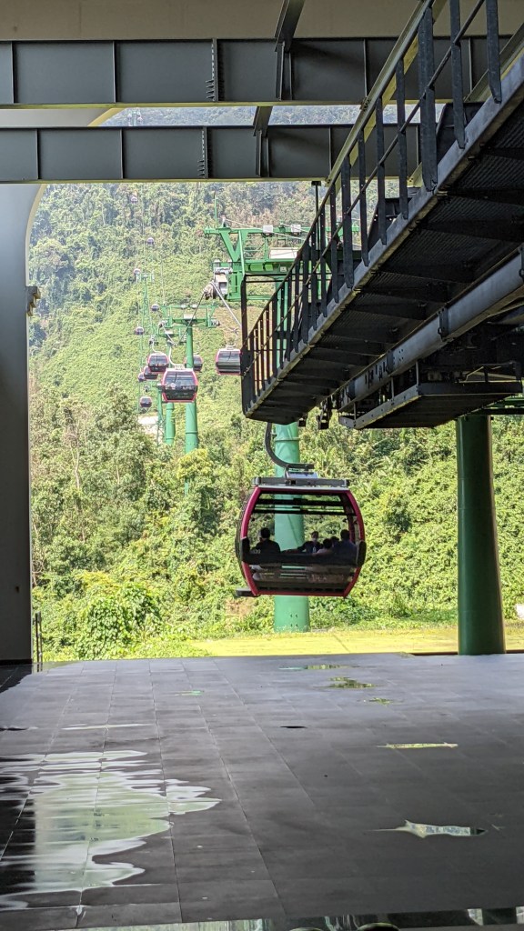 Einen etwas längeren Tagesausflug machten wir in Da Nang auch. Wir haben gelesen und gehört, dass es etwas weiter im Landesinneren eine ganz berühmte „Goldene Brücke“ gibt. Die wollten wir uns natürlich nicht entgehen lassen. Wir haben uns ein Moped gemietet und sind losgefahren. Als wir dort angekommen sind, fanden wir einen riesengroßen Eingangsbereich und wieder sehr viele vietnamesische Touristen. Wir mussten dann ein Ticket für das gesamte Areal der Ba Ne Hills inkl. Gondelfahrten kaufen – dabei ist jedoch alles inkludiert wurde uns gesagt, sogar auch ein Mittagessen. Obwohl das Ticket sehr teuer war, haben wir es uns gekauft, weil wir sonst keine Möglichkeit gehabt hätten, diese Brücke zu sehen. Wir fuhren dann mit einer der längsten Seilbahn der Welt auf dem Berg. Besonders stolz waren wir, weil die Gondel von der österreichischen Firma Doppelmayr kommt. Dabei konnten wir einen wunderschönen Wasserfall und den Urwald von oben sehen – das war sehr schön und beeindruckend. Oben angekommen, konnten wir unseren Augen nicht trauen. Auf diesem Berg in der Höhe von ca. 1.500m ist eine Freizeitanlage der besonderen Art. Es gibt hier Sommerrodelbahnen, einen großen Aktion-Bereich mit Achterbahnen und verschiedenen Kinos (4D, 5D und 360°). Es gibt sehr viele Lokale mit europäischem Touch. Bäckereien aus Frankreich und ein Bierzelt aus Deutschland. Einige Angestellte hatten sogar Dirndln und Lederhose an. Es gibt aber auch etwas ruhigere Bereiche, nämlich einen japanischen Tempel. Und natürlich findet man auch die goldene Brücke da oben am Berg. Es ist wirklich unglaublich, was hier errichtet wurde. Den Grundstein dafür haben übrigens schon die Franzosen in der Kolonialzeit gelegt – die haben hier ein Freizeitangebot mit französischen Touch errichtet.