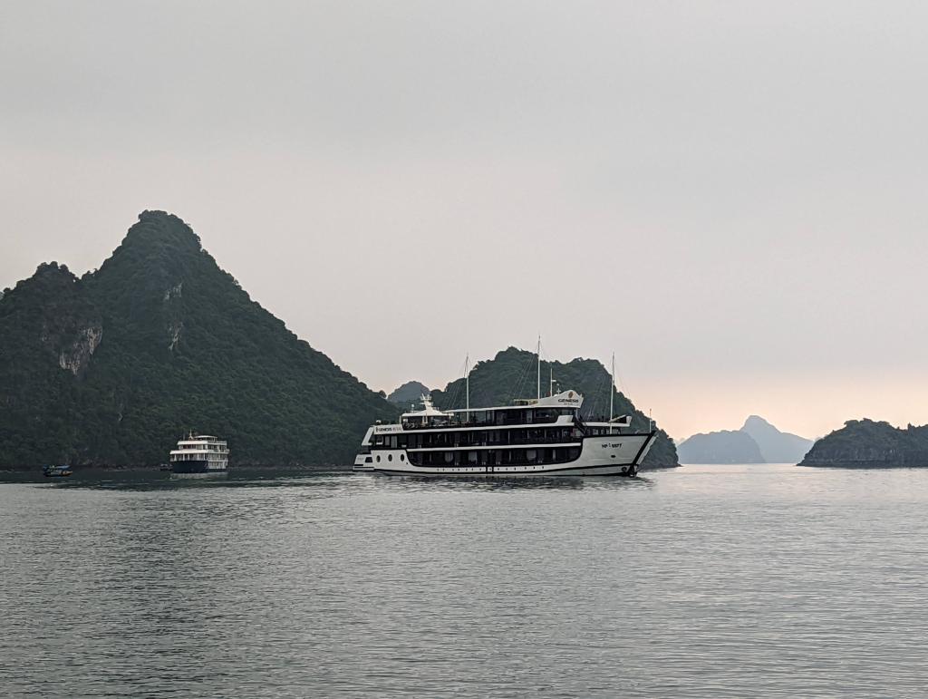 Als uns der Mini-Van nach Ha Long von unserem Homestay in Ninh Binh abgeholt hat, konnten wir ihm noch nicht sagen, wo er uns aussteigen lassen soll. Wir wussten zwar, dass wir die nächste Nacht auf einem Schiff, das durch die Ha Long Bucht fährt, verbringen wollen, doch wir haben im Vorhinein nichts gebucht. Unser Plan wäre gewesen dort hinzukommen und dann direkt einen Anbieter zu finden. Während der Fahrt haben wir begonnen zu recherchieren und wir stellten zu unserem Entsetzen fest, dass die meisten Schiffe ausgebucht sind. Fast alle starten auch um ca. 12 Uhr mittags und da unser Chauffeur in der Früh ziemlich verspätet kam, hatten wir starke Bedenken, dass sich das ausgeht. Wir haben uns schon darauf eingestellt, dass wir eine Nacht am Land verbringen müssen bevor wir dann auf ein Schiff können. Trotzdem haben wir mehrere Unternehmen kontaktiert und eine Reederei hat uns ein tolles Last-Minute-Angebot gemacht, da nur noch 1 Kabine für die kommende Nacht frei war. Die Dame hat dann sogar mit unserem Chauffeur telefoniert um sicherzustellen, ob wir pünktlich am Hafen ankommen – er hat es ihr versichert und so haben wir gleich gebucht und bezahlt. Um ca. 15 Minuten vor 12 Uhr ließ er uns genau bei der Anlagestelle aussteigen, die Leute vom Schiff warteten schon auf uns – wir waren die letzten Gäste und nach nur wenigen Minuten waren wir schon im kleinen Boot am Wasser zum Kreuzfahrtschiff. Wir haben es geschafft, wir waren pünktlich! Die kommende Nacht verbringen wir auf See! Unsere Freude war riesengroß!
