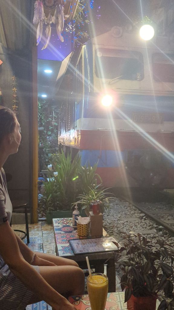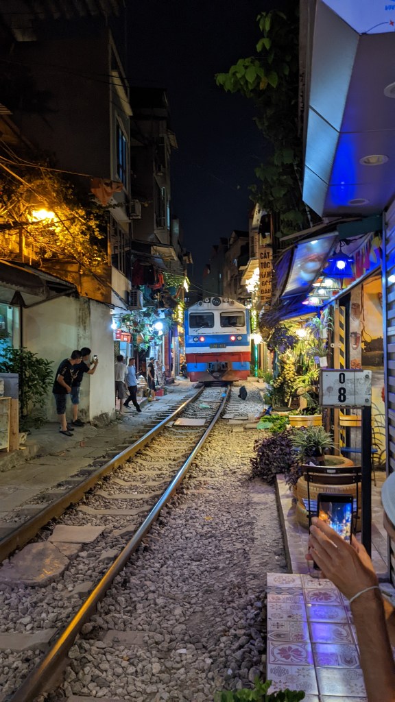 Einen lustigen Abend verbrachten wir in der Train Street. Dort haben wir auch unser Jubiläum gefeiert: 4 Monate Weltreise. Die Train Street kann man sich so vorstellen, dass ganz nahe an Gleisen viele kleine Lokale sind. Wenn man Glück hat, dann fährt der Zug auch tatsächlich vorbei – das ist ganz schön knapp. Da darf man sich nicht zu weit nach vorne lassen. Es war ein sehr aufregendes Erlebnis dem Zug so nahe zu sein. In Österreich dürfte so etwas niemals sein – gerade deshalb ist es noch viel spannender für uns.