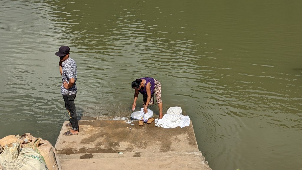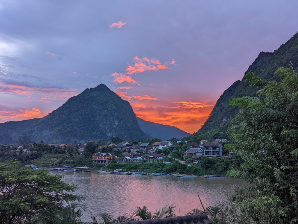 Muang Ngoy hat uns sehr gut gefallen. Am spannendsten war es das Leben am Fluss zu beobachten. Hier spielt sich alles ab – die Menschen können ja auch nur über das Wasser zu anderen Orten fahren. Der Fluss ist ein richtiges Lebenselixier für die Menschen hier tief im Landesinneren von Laos. Kinder schwimmen und spielen darin. Frauen waschen ihre Wäsche im Fluss. Männer fahren fischen oder waschen ihr Werkzeug. Es war immer sehr ruhig und wir haben die entspannte Stimmung genossen. Sehr schön war auch, dass wir vom Bett aus einen so tollen Ausblick auf die Landschaft hatten. Wir sind sehr froh, dass wir nicht nur die unter Touristen bekannten Städte machten sondern auch wirklich ins Land hinaus gekommen sind. Es war einfach wunderbar!