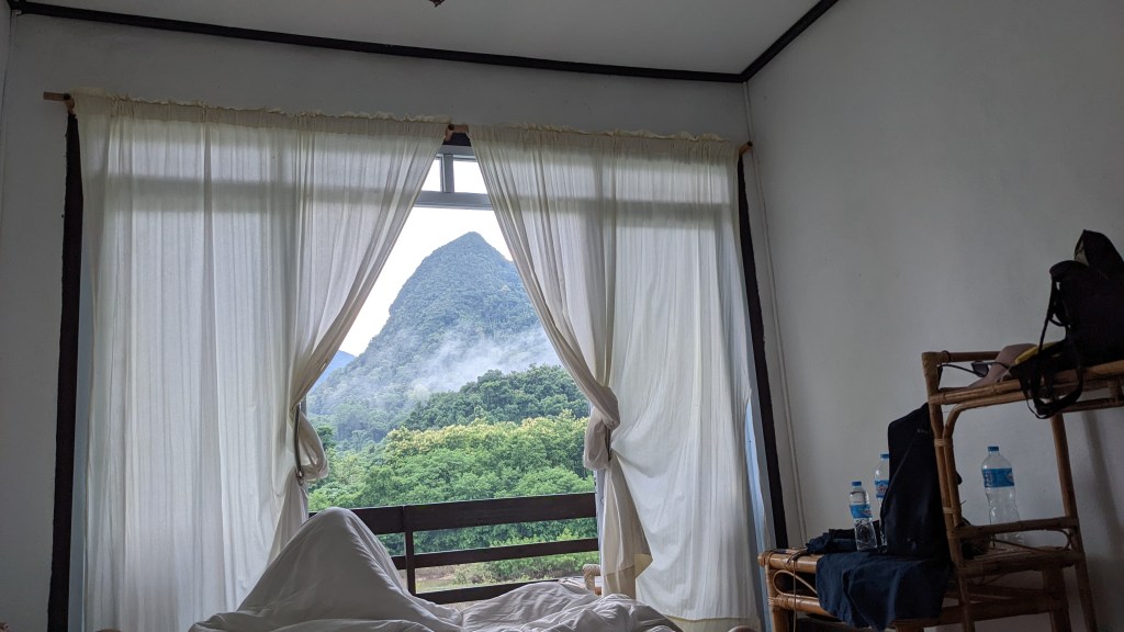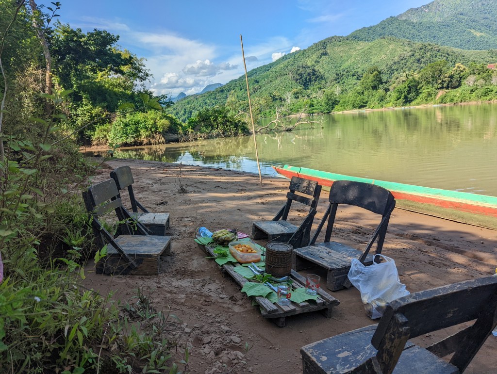 In Luang Prabang haben wir richtig Lust bekommen noch weiter in den Norden zu fahren und tiefer in das Land Laos einzutauchen. Wir haben uns für zwei weitere Dörfer entschieden, in denen wir nächtigen wollen: Nong Khiaw und Muang Ngoy. Ein Mini-Van brachte uns von Luang Prabang nach Nong Khiaw. Die Fahrt war ziemlich anstrengend, die Straße war teilweise richtig kaputt und es gab viele Schlaglöcher. Aber wir haben es geschafft und sind in einem kleinen verschlafenen Dorf angekommen. Es war Mittagszeit und sehr heiß, deshalb suchten wir uns zuerst gleich mal ein Lokal und aßen Lao Noodle Soup. Weil sie so gut geschmeckt hat, waren wir nicht das letzte Mal dort. In einem kleinen aber feinen Gästehaus haben wir dann eingecheckt. Es gab eine große Terrasse mit tollen Blick auf den Fluss und die Berge – da haben wir uns richtig wohl gefühlt.