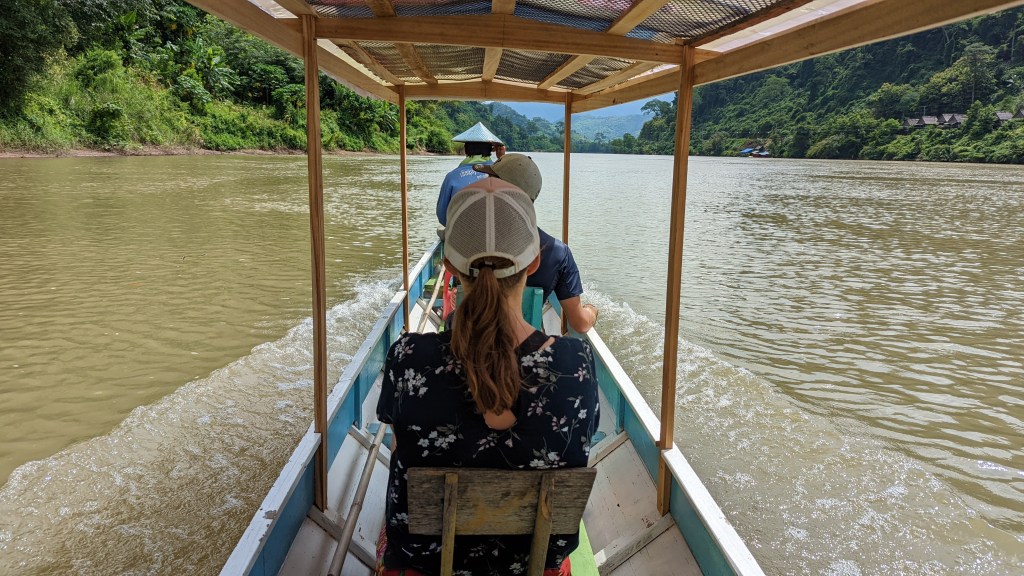 Nur über das Wasser und mit einem Boot kommt man in das Dorf Muang Ngoy. Die Fahrt dauerte ca. 45 Minuten und war wunderschön. Mitten in der Natur zwischen hohen grünen Bergen fuhren wir in das Dorf, das noch viel kleiner und verschlafener war als Nong Khiaw. Hier ist wirklich alles noch sehr ursprünglich – die Menschen wohnen in kleinen Hütten und versorgen sich selbst. Zur Zeit von Corona hat die Regierung alle Menschen aus der Stadt auch einfach aufs Land zu den Familien geschickt und dort haben sie sich selbst versorgt und die Corona-Zeit überstanden.