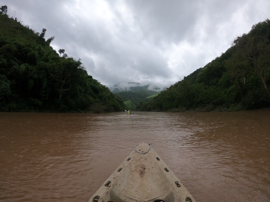 Am nächsten Tag ging es nach dem Frühstück wieder los. Diesmal mussten wir alles sehr gut anbinden, denn das Wasser sollte wilder sein. Außerdem hat es geregnet und ich habe die Regenjacke angezogen. Am Anfang war alles noch in Ordnung und wir genossen den Regen am Wasser mitten in der Natur von Laos. Kalt war es nämlich überhaupt nicht. Nach einiger Zeit ist es jedoch passiert. Von der Ferne haben wir schon gesehen, dass wir auf höhere Wellen als bisher zusteuern. Unser Tourguide und Mike kamen gut durch – dann waren wir dran und ich kann euch gar nicht sagen wie schnell es gegangen ist und wir sind im Wasser geschwommen. Die große Welle konnten wir einfach nicht schaffen und unser Kajak kippte um. Alles ist geschwommen und wir waren froh, dass wir eine Schwimmweste hatten, denn die Strömung war richtig stark und hat mich im Wasser von René und dem Kajak weggezogen. Nach einiger Zeit haben wir jedoch geschafft wieder am Kajak zu sitzen und wir haben alles eingesammelt und aufgeladen. Von diesem Zeitpunkt an war das Kajak fahren für mich nicht mehr so lustig. Ich hatte bei allen weiteren Wellen Angst, dass wir wieder umschmeißen.