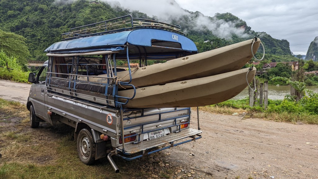 Unser Tourguide hat diese Tour das letzte Mal vor 3 Jahren gemacht (vor Covid). Außerdem hat er die Tour noch nie in der Regenzeit gemacht und der Fluss könnte etwas anders aussehen als gewohnt. Aber er war davon überzeugt, dass es funktioniert und wir haben eingestimmt. Er hat alles organisiert und nach ein paar Tagen ging es schon los. Mit einem Tuktuk wurden wir zum Fluss gebracht. Das Fahrzeug war komplett voll beladen: 2 Kajaks, 4 Padel, 4 Schwimmwesten, 4 Helme, Essen & Getränke für 4 Personen und 3 Tage und dann mussten wir mit unseren Drybags auch noch drauf. Es ist sich alles ausgegangen.