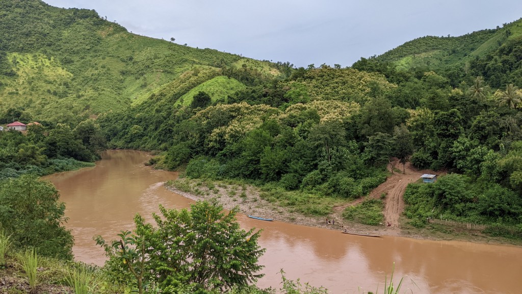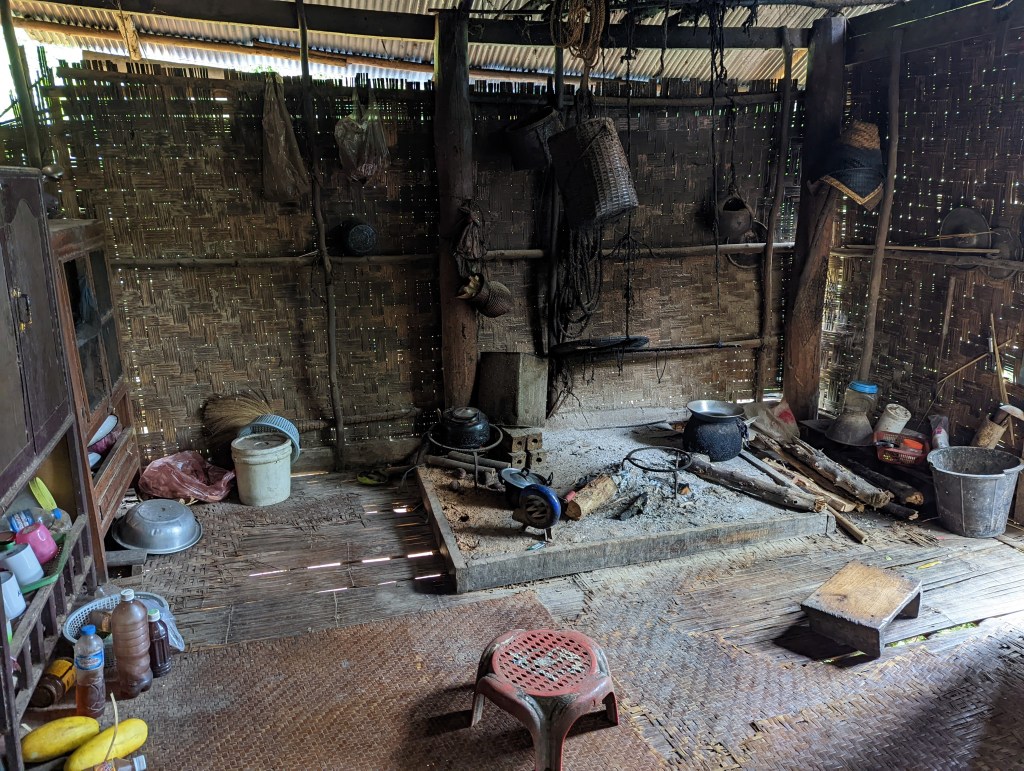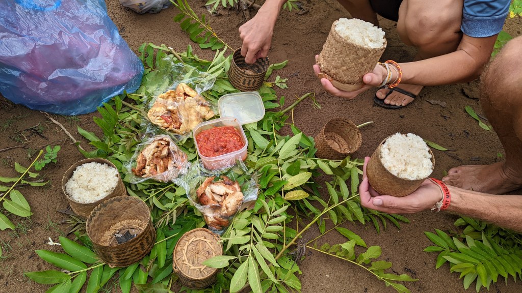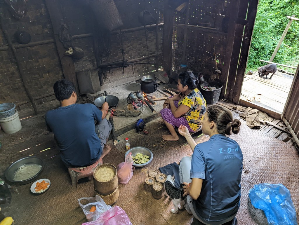 Am Fluss angekommen zogen wir uns alles an und das gesamte Gepäck wurde befestigt. Es ging los! Der Fluss war sehr braun und das Wasser hoch – damit hat unser Tourguide selbst nicht gerechnet. Der erste Tag war wunderschön. Der Himmel war bedeckt, so war es nicht sehr heiß sondern angenehm warm. Bei völliger Stille und nur mit Naturgeräuschen begleitet paddelten wir durch Laos. Das Mittagessen genossen wir einfach am Ufer. Um ca. 15 Uhr sind wir dann in dem ersten Dorf angekommen, in dem wir nächtigten. Wir mussten zuerst zum Häuptling des Dorfes um nachzufragen, ob wir hier bleiben dürfen. Am Anfang war er skeptisch, doch schlussendlich hat er eingewilligt und wir durften auch gleich in seinem Haus bleiben und dort nächtigen. Das Wort „Haus“ ist jedoch etwas übertrieben. Es handelte sich vielmehr um eine offene Bambushütte. Die Küche war nebenan, ein Bambus-Zubau wo mit offenem Feuer gekocht wird. Ich habe noch nie in so einem undichten Gebäude genächtigt, doch es war eine großartige Erfahrung.