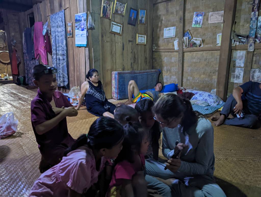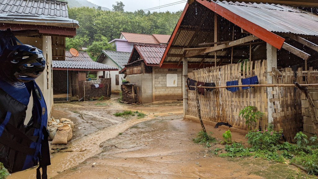 Das Mittagessen am Ufer war wieder sehr lecker. Dort ergriffen wir auch die Möglichkeit unsere Drybags zu öffnen um kontrollieren zu können, ob etwas nass geworden ist. Zum Glück war alles trocken und nur wir selbst waren durch und durch nass. Nach der Mittagspause hatten wir zum Glück nicht mehr lange und wir haben es gerade noch rechtzeitig in das 2. Dorf geschafft, bevor es wieder voll zu regnen begonnen hat. Diesen Regen konnten wir schon unterm Dach genießen und beobachten.