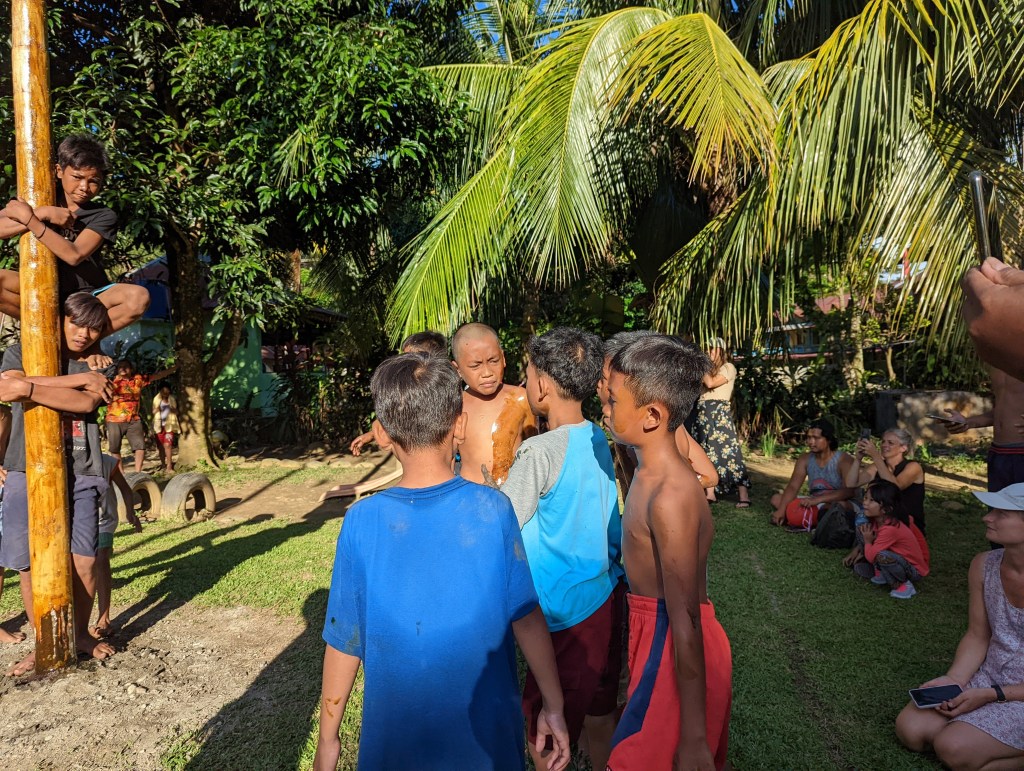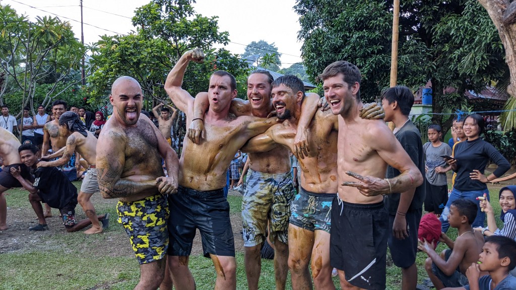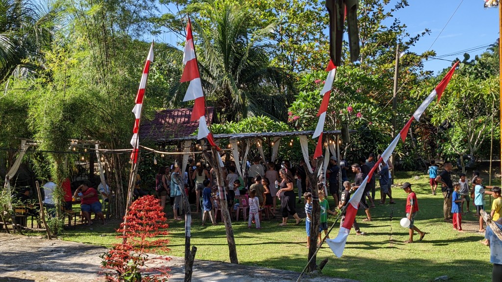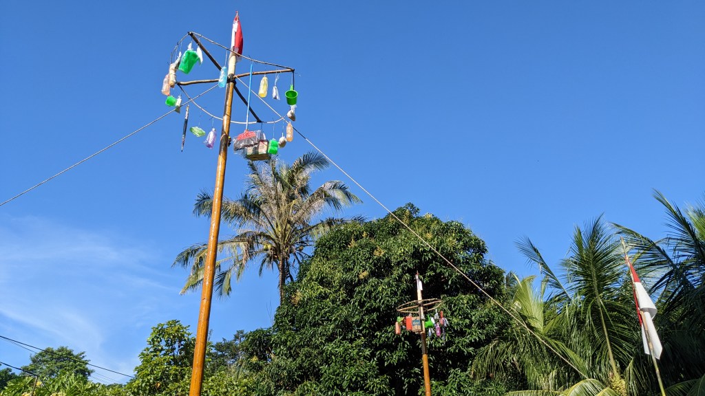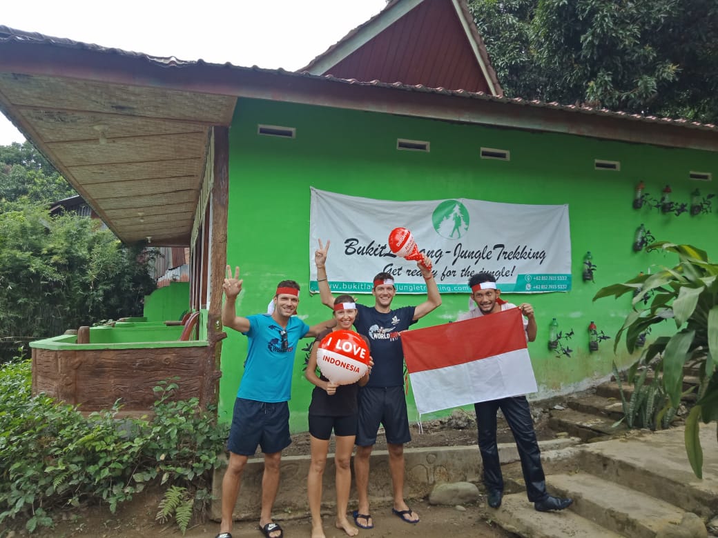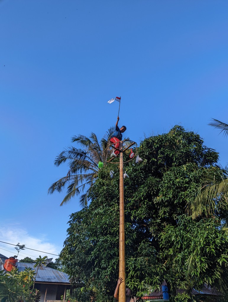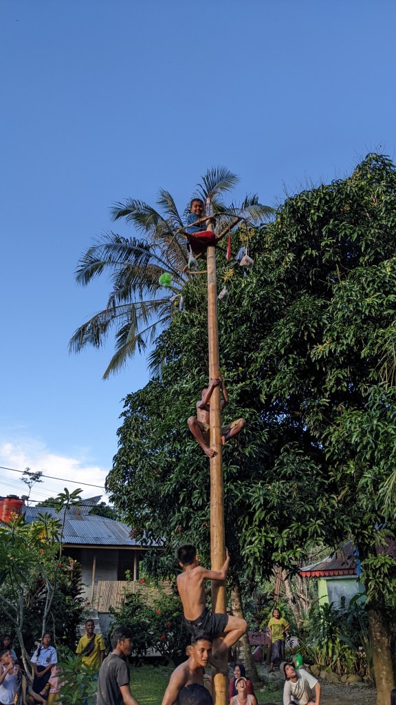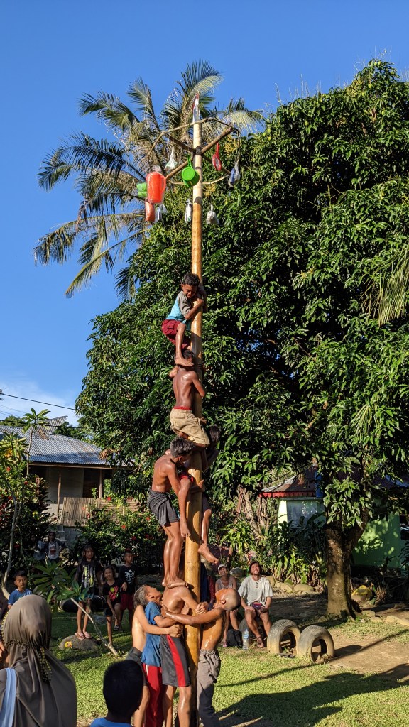 Da wir genau zum Unabhängigkeitstag von Indonesien wieder zurück in die Zivilisation kamen, hatten wir die Ehre bei einem ganz traditionellem Spektakel dabei zu sein. Es wurden zwei Bäume mit Geschenken aufgestellt. Ein Baum war etwas kleiner – für die Kinder und der zweite Baum war höher und für die Erwachsenen gedacht. Der Baum wurde dann mit Motoröl eingecremt und dann hieß es kraxeln. Zuerst haben die Kinder begonnen und es war ein Wahnsinn zu sehen wie die Buben auf diesen Baum geklettert sind. Am großen Baum hat eine Touristengruppe den Anfang gemacht, leider jedoch ohne Erfolg. Das ganze Spektakel hat mich sehr stark an das „Maibaum kraxeln“ erinnert. Der Spaß ist nicht zu kurz gekommen. Lustig war außerdem, dass wir genau an diesem Tag 4 Wiener und 2 aus Wels getroffen haben. Noch nie zuvor auf unserer Weltreise haben wir so viele Österreicher auf einmal gesehen. Der Abend war deshalb noch sehr lustig und wir haben es genossen auch mit Fremden mal wieder in unserem österreichischen Dialekt sprechen zu können. Danke für’s Kennenlernen, es war wirklich lustig!