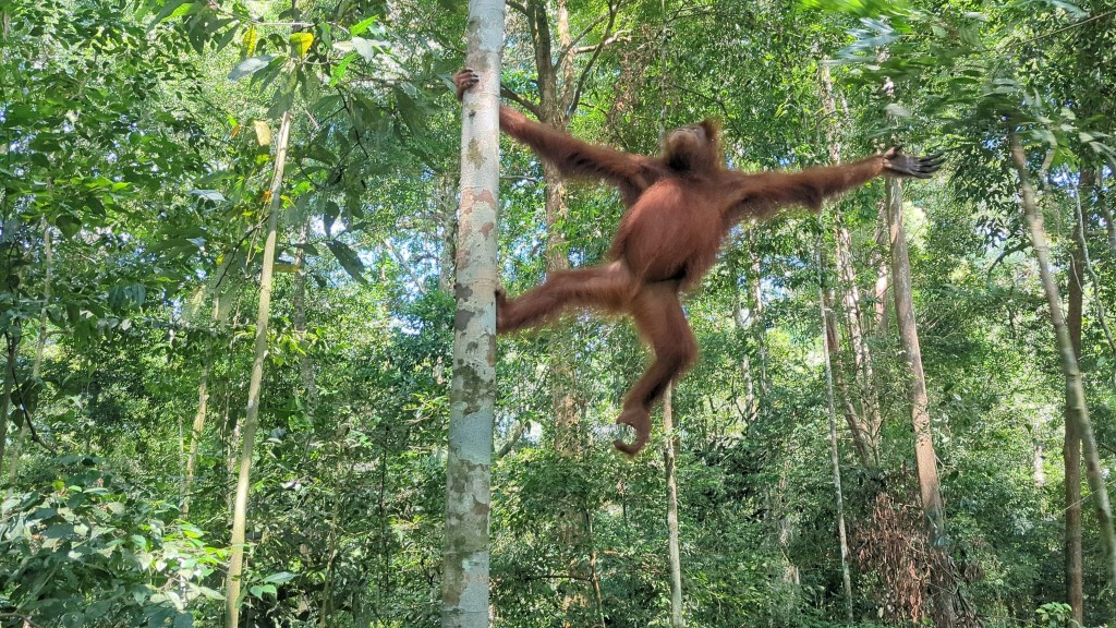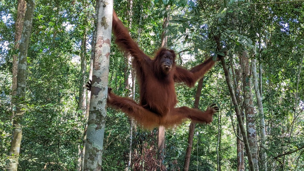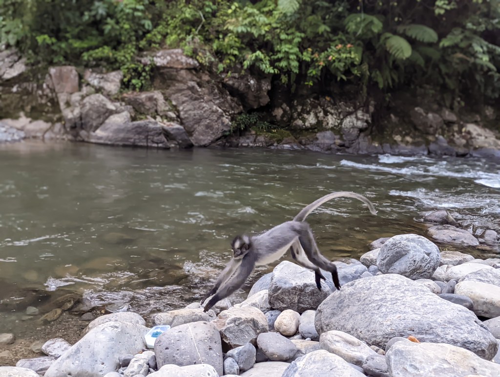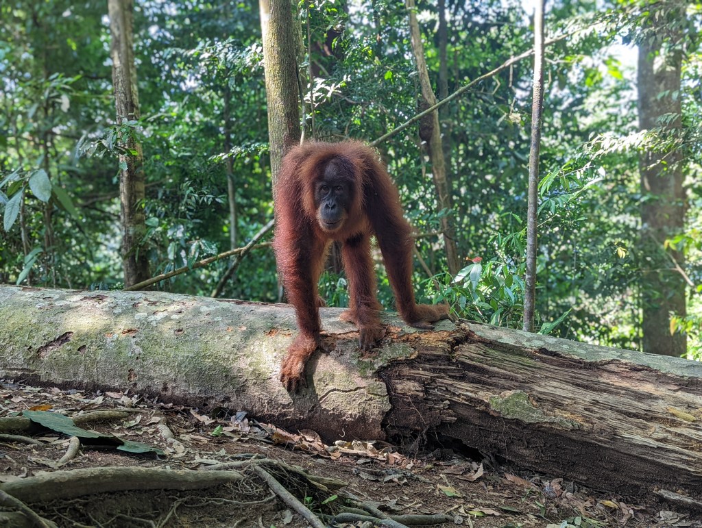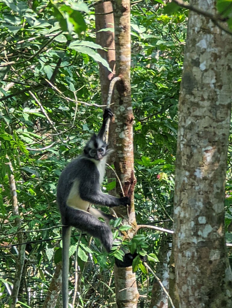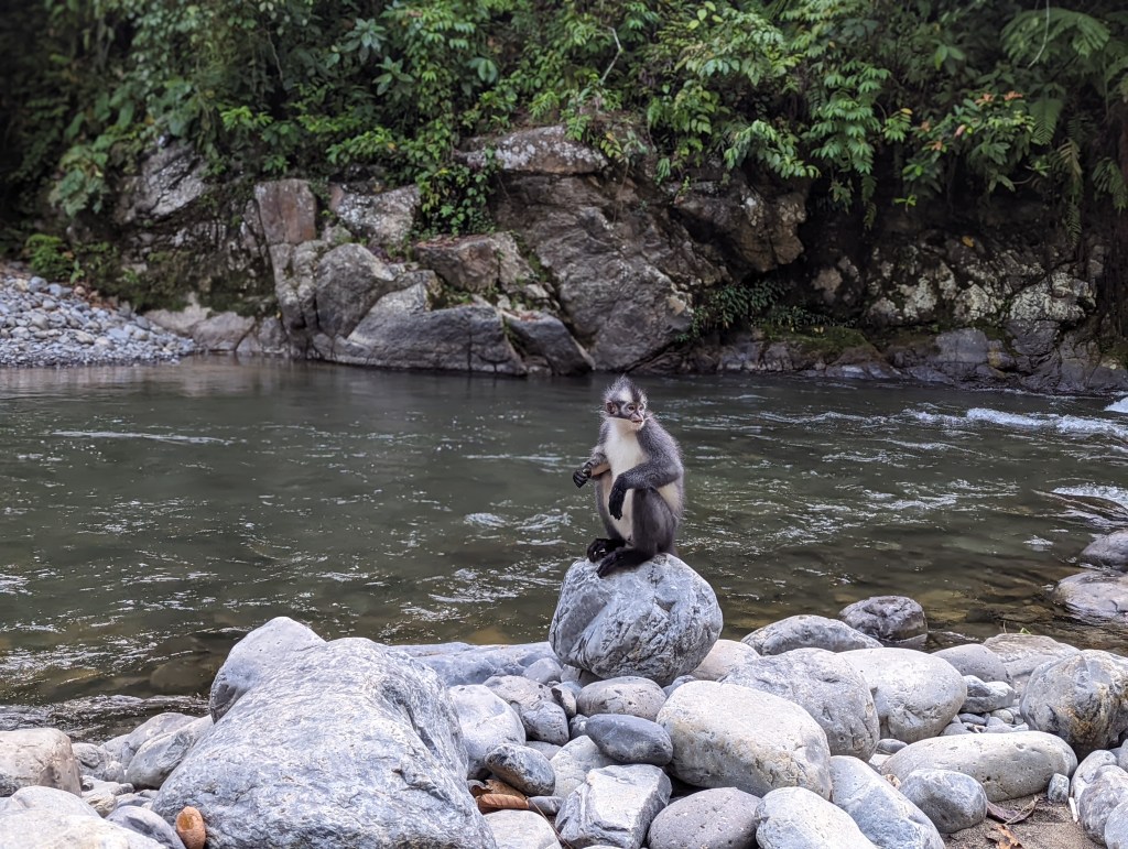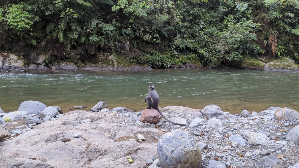 Gemeinsam mit einem deutschen Paar ging es am 1. Tag um ca. 9 Uhr los. Unsere Tourguides waren Monang und Bandi von Bukit Lawang Jungle Trekking. Sie waren die absolut besten Begleiter, die wir uns je vorstellen hätten können. Gleich am Anfang hat uns Monang vieles über die Palmölindustrie und die Gummibäume erzählt. Das war sehr spannend. Es hat nicht lange gedauert und schon haben wir unsere ersten Orang Utans gesehen. Es war eine Mama mit ihrem Kind – besonders das Kleine war sehr süß und ist schon tapfer durch die Bäume geklettert und gehüpft. An diesem ersten Tag hatten wir generell Glück, wir haben nämlich noch mehrere Orang Utans gesehen. Außerdem haben wir den Thomas-Langur-Affe gesehen. Der ist schwarz, grau und weiß und hat eine sehr lustige Frisur.