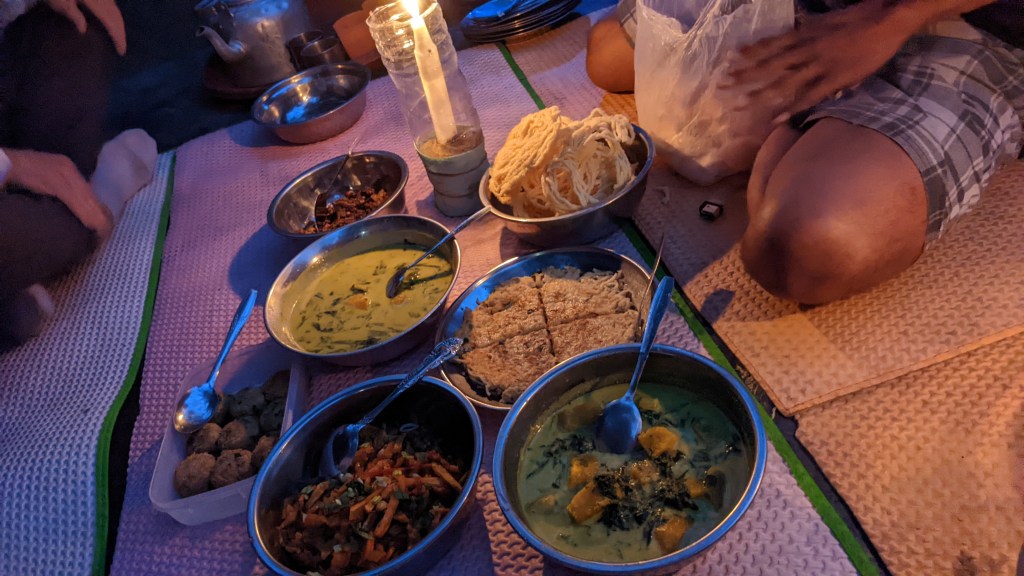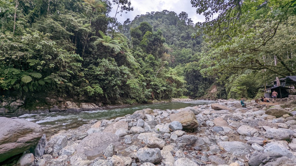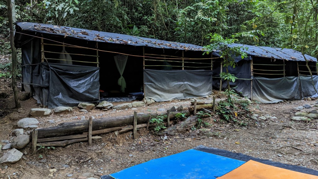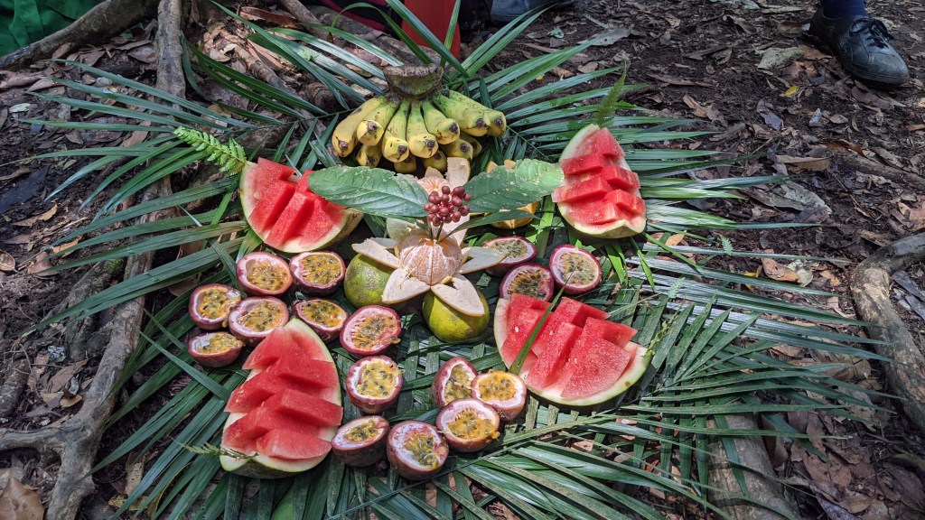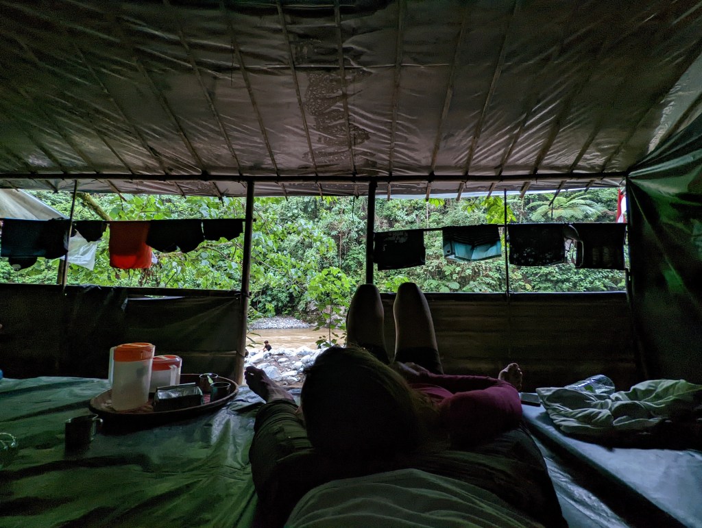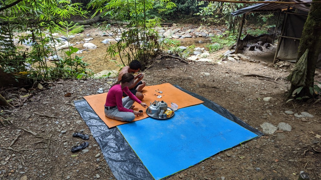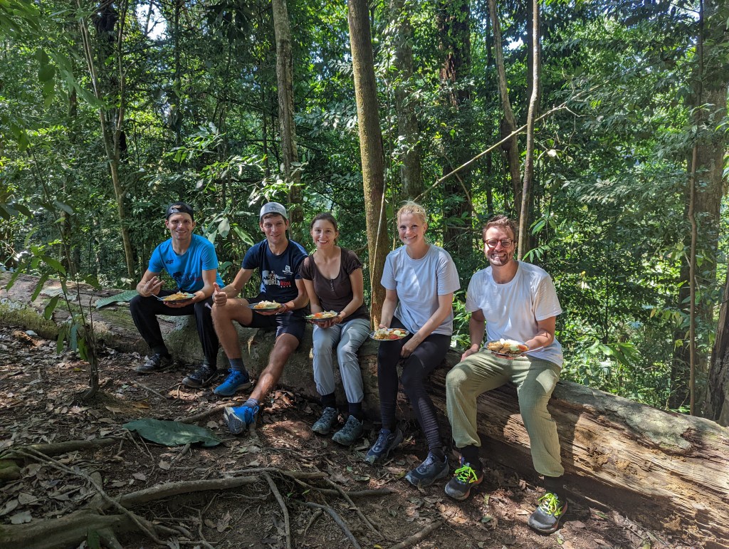 Jeden Vormittag bekamen wir leckeres Obst und auch das Mittagessen hatten die Guides immer dabei. Als wir dann in die jeweiligen Camps gekommen waren, in denen wir genächtigt haben, gab es Kaffee und Tee mit Kekse sowie abends ein großzügiges Abendessen und einen Ginger Tea. Kulinarisch ist es uns richtig gut gegangen, obwohl wir mitten im Dschungel waren. Auch unser „Zimmer“ im Dschungel war schwer in Ordnung. Wir haben in einen großen Zelt mit dicker Plane geschlafen und jeder bekam eine dünne Matratze mit Moskitonetz. In der ersten Nacht haben wir richtig gut geschlafen, nach der zweiten Nacht hat aber der Rücken doch ganz schön weh getan.