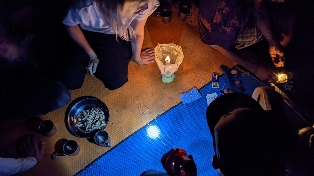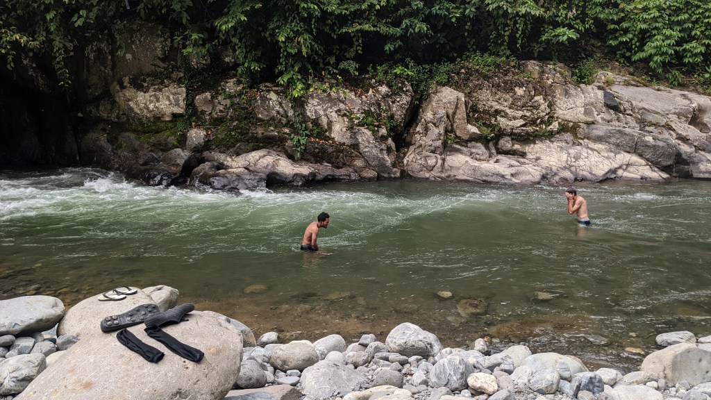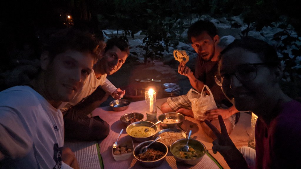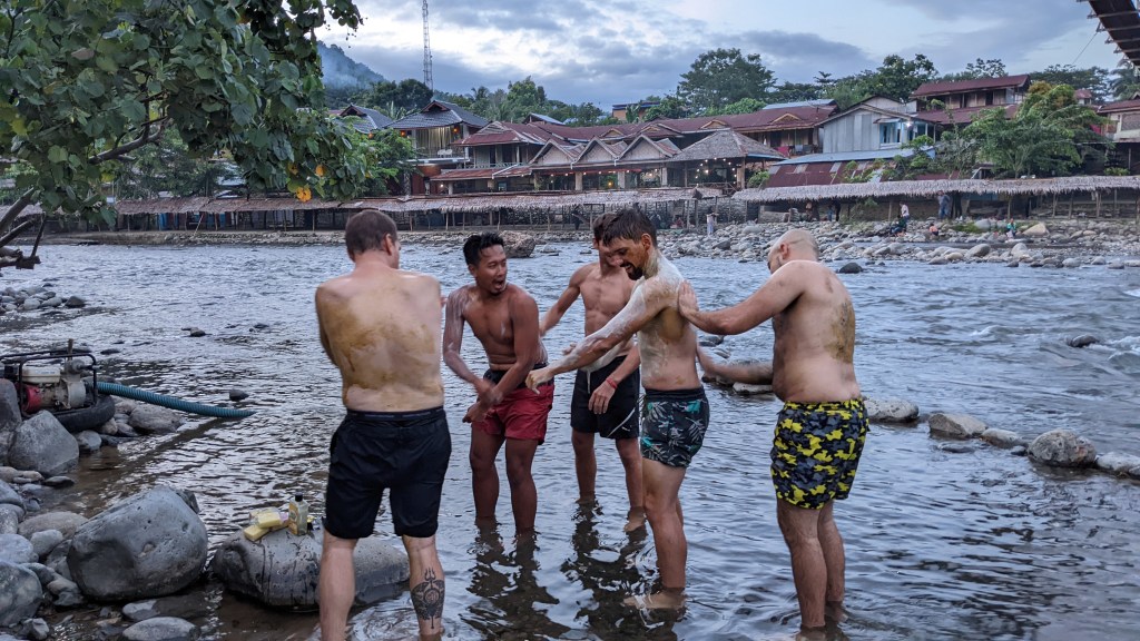 Die Abende in den Camps waren immer sehr lustig. Wir haben mit unseren Tourguides Spiele gespielt und sie haben uns Zaubertricks gezeigt. Wir hatten richtig Spaß. Bis am Schluss ist der Spaß nicht zu kurz gekommen und so sind wir auf Tubes in einem Fluss zurück in das Dorf gefahren. Das Wasser war teilweise etwas wild und so wurden wir richtig nass und es spritze oft. Aber wir sind gut zurückgekommen und hatten auch bei dieser Fahrt jede Menge Spaß. Wir sangen nämlich auch das berühmte Dschungel-Lied, das die Melodie von „Jingle Bells“ hat: