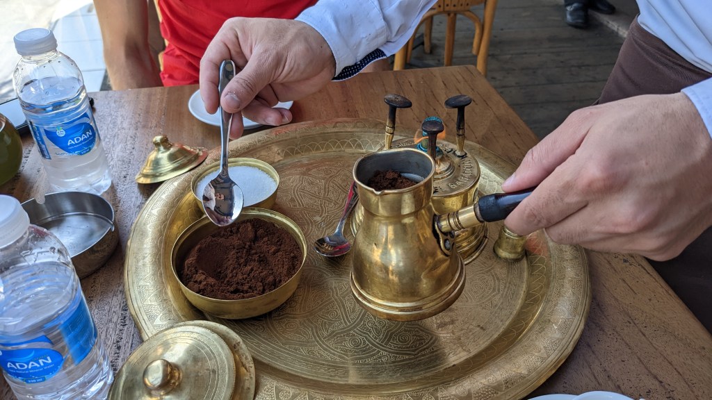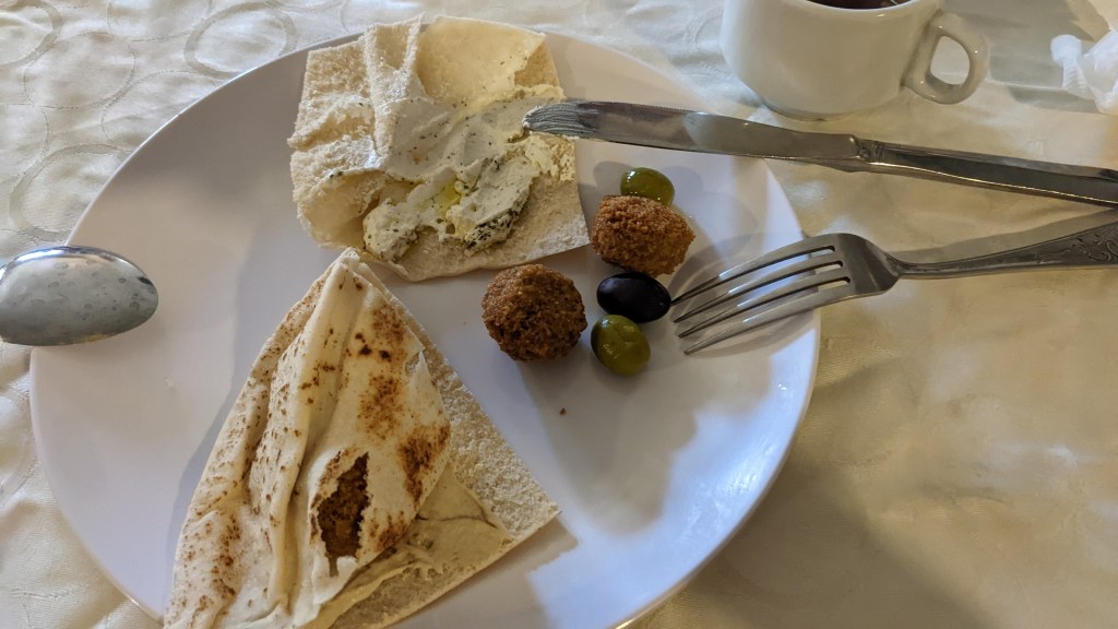 Bereits zum Frühstück wurden wir dann von dem jordanischen Essen überrascht. Es gab köstliches Pita-Brot mit Falafel und Hummus. Dazu gab es heimische Oliven. Das Essen aus Jordanien schmeckt uns besonders gut. Natürlich haben wir auch einen Shawerma, bei unser besser bekannt als Kebab, gekostet. Das Pita-Brot bekommt man überall und schmeckt herrlich lecker. In den vielen Cafés gibt es auch leckeren arabischen bzw. türkischen Kaffee. Der wird ganz frisch direkt nach der Bestellung gemacht und hat durch das Kardamon-Gewürz einen ganz besonders guten Geschmack. In jedem Café findet man auch viele Shishas. Hier rauchen alle immer Shisha, egal ob Mann oder Frau. Neben dem Getränk steht auch immer eine Shisha und überall duftet es herrlich.