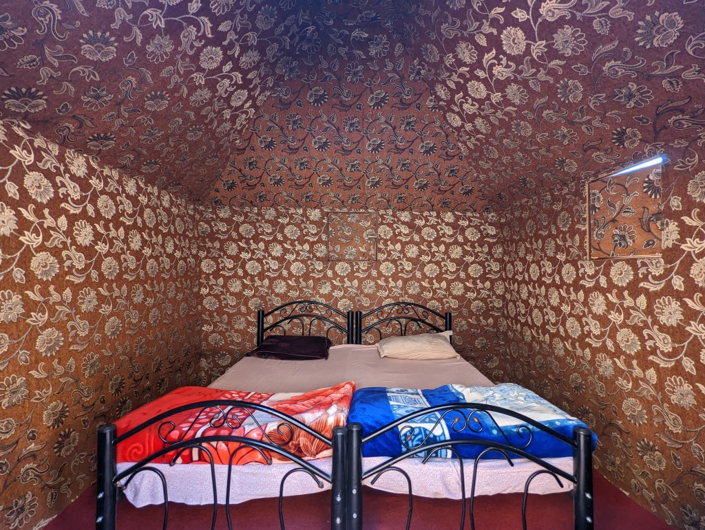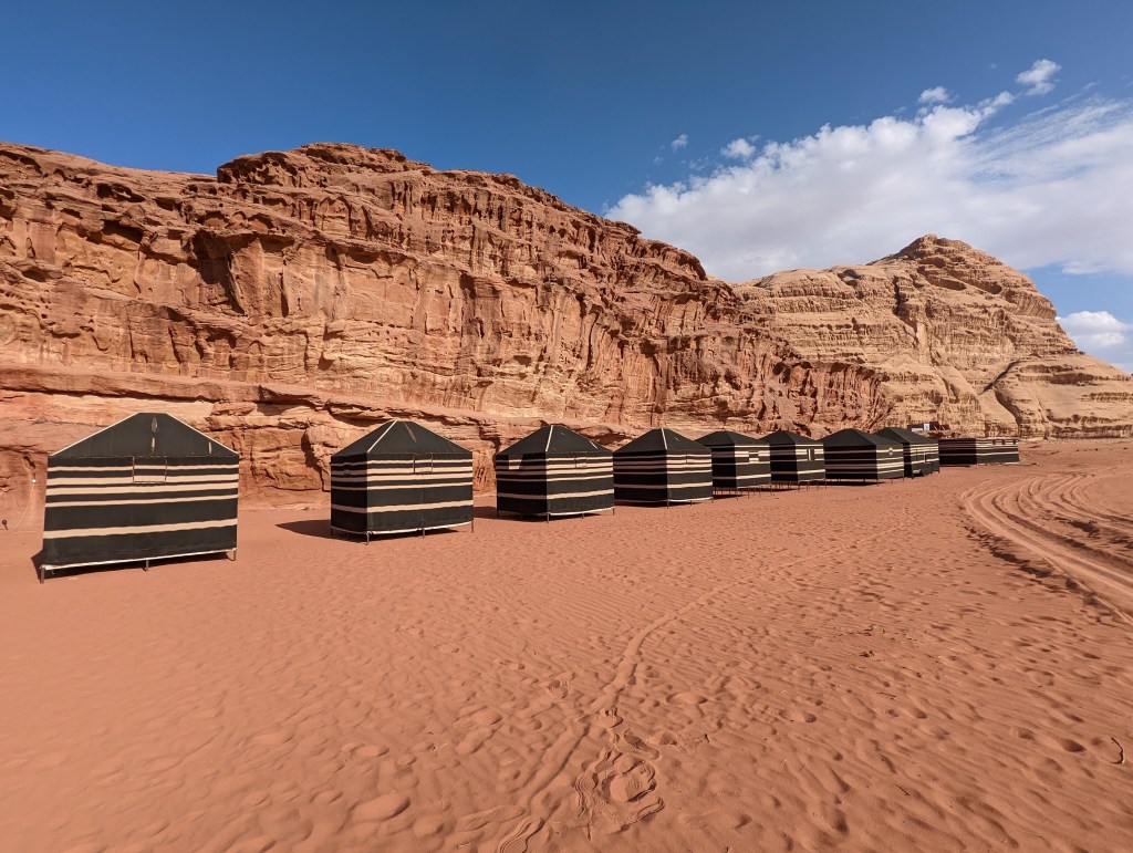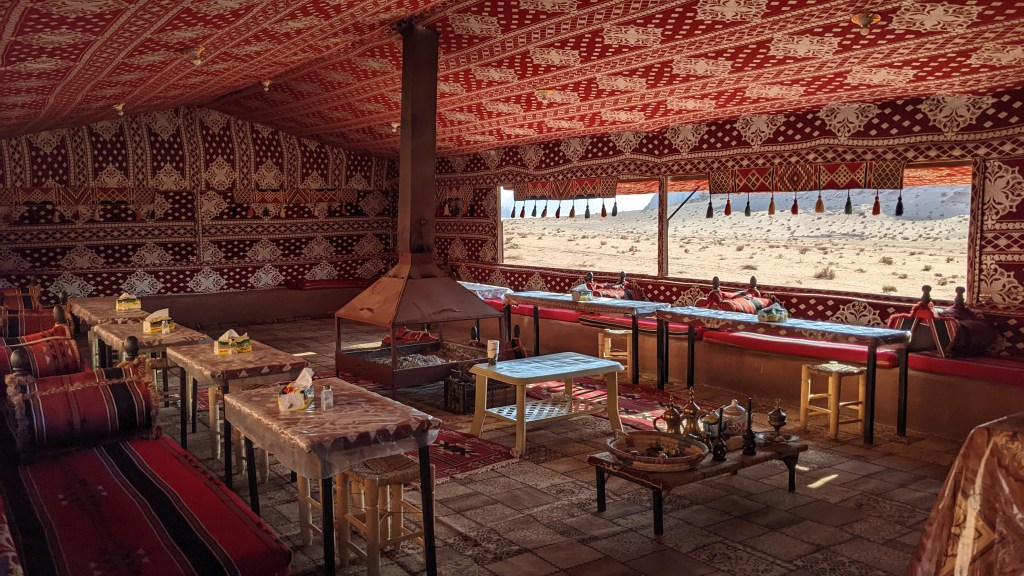 Schon die Ankunft in der Wüste war wunderschön und unkompliziert. Bevor wir in das Camp und zu unserem Hüttchen gebracht wurden, tranken wir mit dem Organisator einen Beduinen-Tee am Teppichboden in seinem Haus. Er hat uns erklärt wie alles abläuft und wir bekamen erste Einblicke in das Leben hier. Anschließend fuhren wir mit einem Jeep in die Wüste, das letzte Camp war unseres – dort wurden wir abgeliefert. In einer großen Hütte gibt es Abendessen und Frühstück und in den kleinen Hüttchen findet man die Betten. Ganz am Ende gab es auch Toiletten und Duschen. Alles war sehr schön, sauber und nett dekoriert. Wir haben uns sofort alles angesehen, der Blick in die Weite der Wüste war sehr schön.