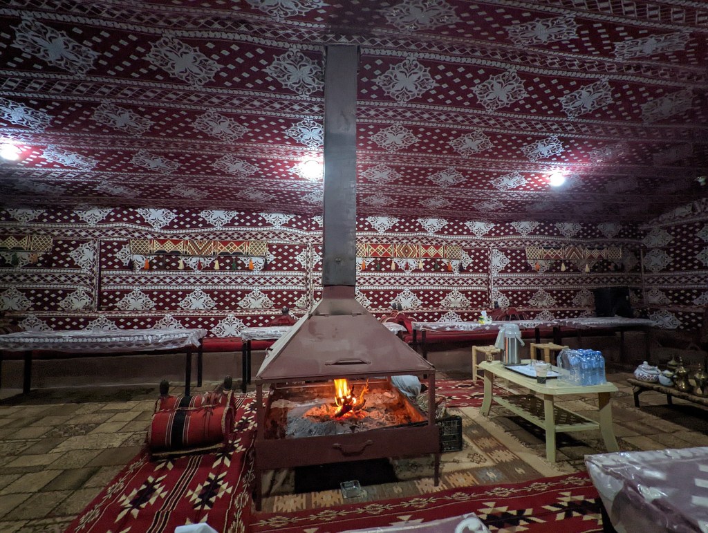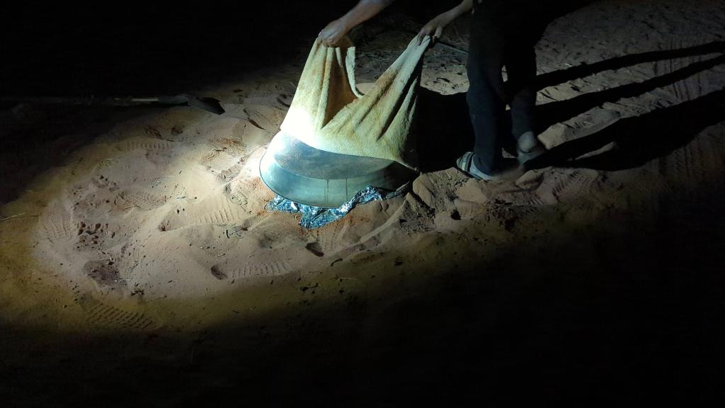 Am Abend gab es dann ein leckeres Abendessen. Die Beduinen machen im Sand Feuer und grillen so ihre Mahlzeiten. Das wurde uns gezeigt und durften wir auch verkosten. Am schönsten fand ich, dass in der Mitte vom großen Zelt offenes Feuer war. Die Einheimischen haben sich immer um das Feuer gesetzt und Tee getrunken. In der Nacht wird es hier nämlich richtig kalt und man freut sich über Wärme vom Feuer. Besonders beeindruckt hat uns dann auch noch der wunderschöne Sternenhimmel.