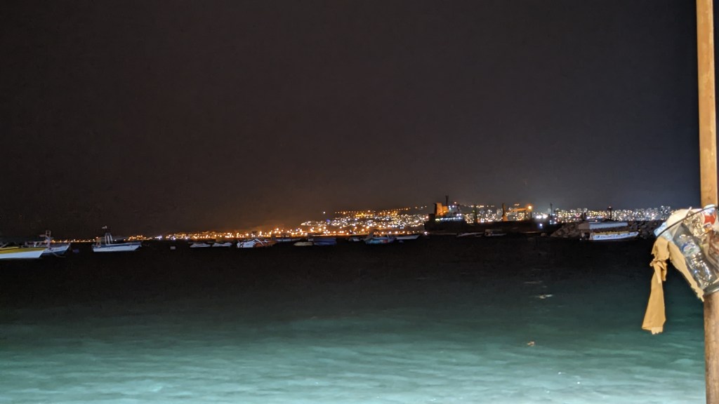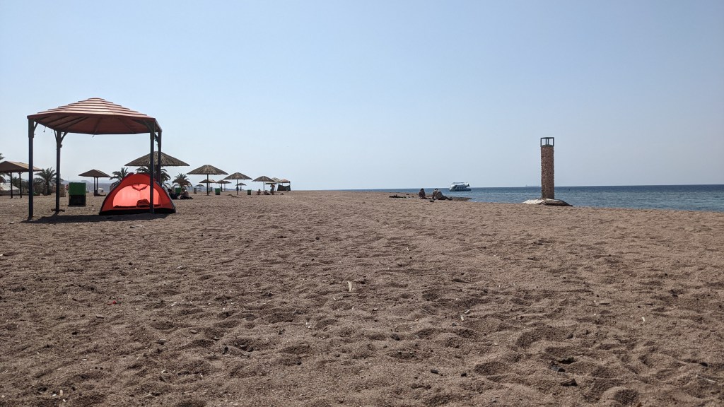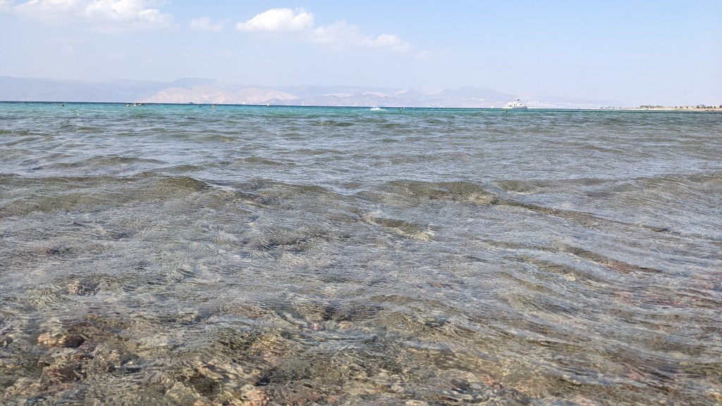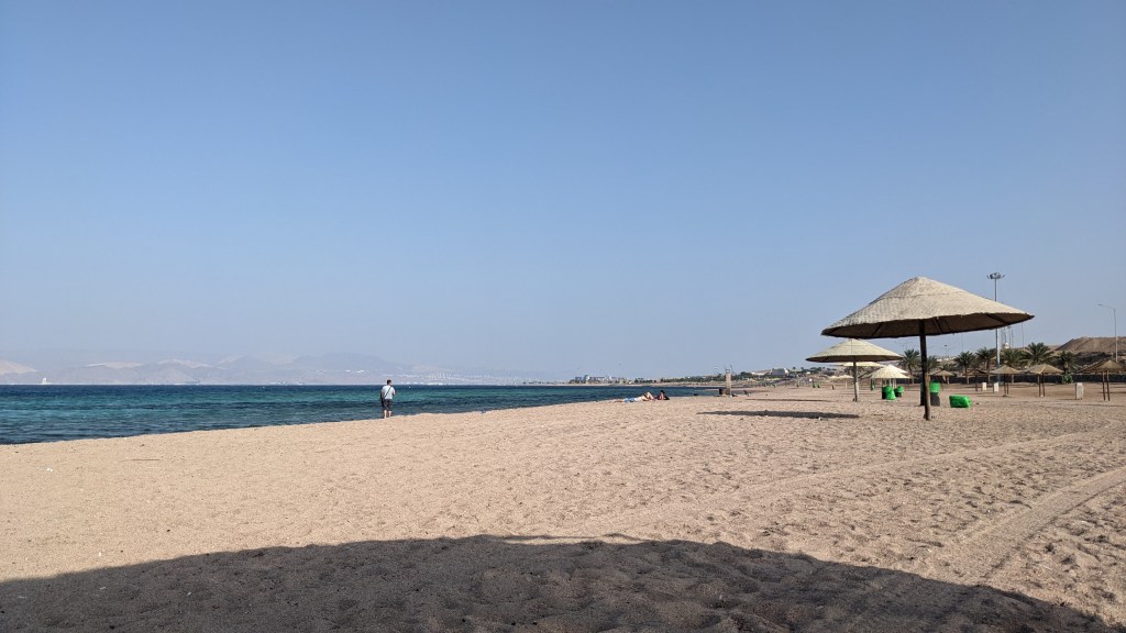 Ganz im Süden von Jordanien liegt die Stadt Aqaba. Hier hat man Zugang zum roten Meer. Es ist sehr cool, dass wir in Jordanien zwei Meere besuchen durften. Wir waren außerdem nur eine halbe Stunde von der Grenze zu Saudi-Arabien entfernt und haben über das Meer nach Ägypten und Israel gesehen. Das finde ich immer besonders spannend, wenn man über Ländergrenzen hinweg blicken kann.