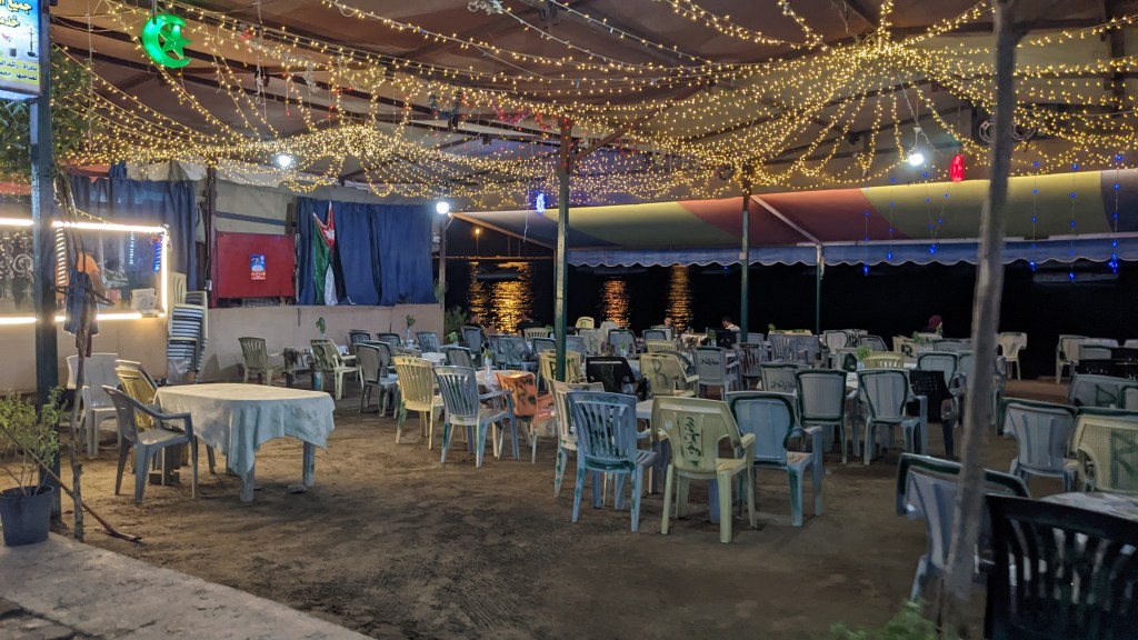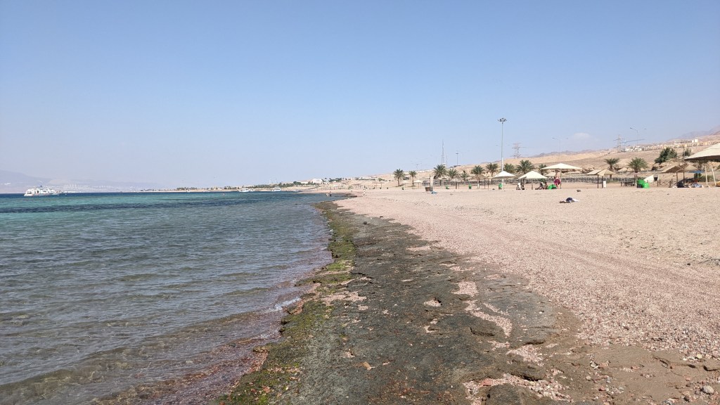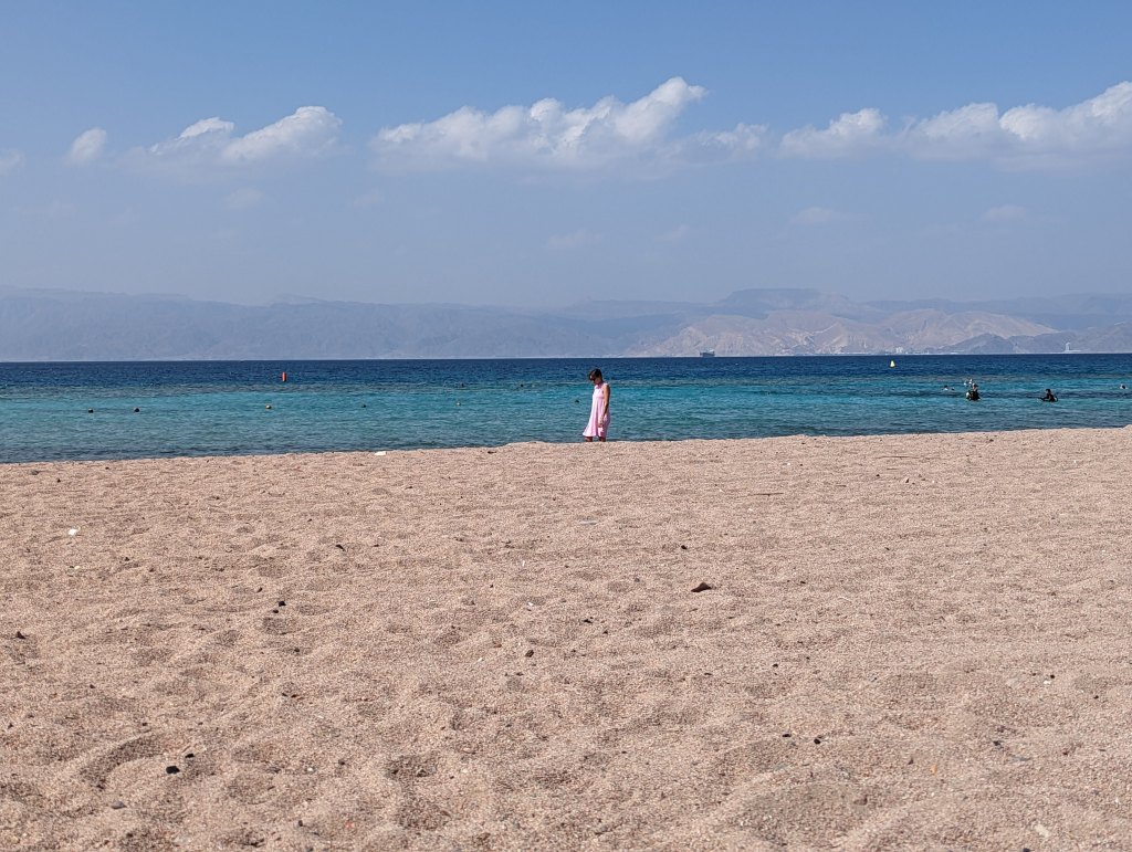Am Abend haben wir in einem netten Café am Strand einen Kaffee und die typischen arabischen Süßigkeiten, nämlich Baklava verspeist. Dabei haben wir den Blick auf Israel genossen. Aqaba ist generell sehr touristisch, auf den Straßen sieht man viele Touristen. Zum Glück war dies aber am Strand vom Roten Meer nicht so. Einen ganzen Tag waren wir dort. Wir gingen aber beide nur einmal in das Wasser und haben geschnorchelt, weil das Wasser so kalt war. Hier gibt es auch Jahreszeiten und es ist jetzt Herbst, da sind die Temperaturen geringer als im Sommer. Die Stimmung am Strand mit dem Blick aufs Meer und der Windbrise im Haar war sehr entspannend und schön.