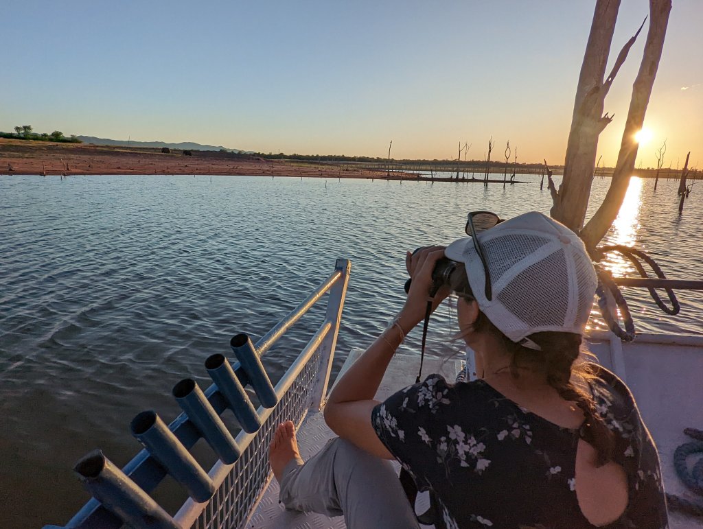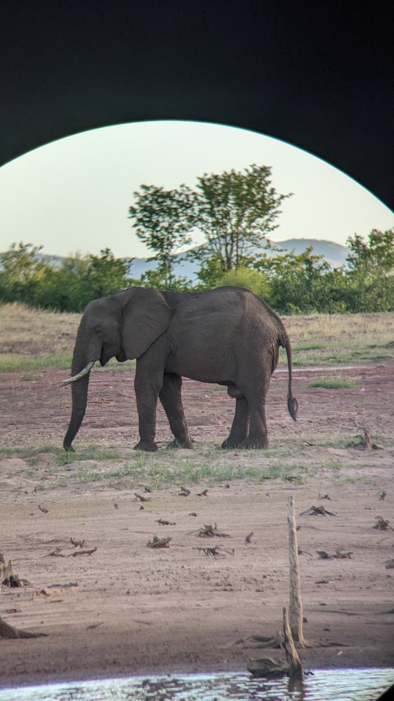 Am nächsten Tag hatten wir einen wunderschönen Sonnenuntergang. Zuvor sind wir wieder mit einem kleinen Boot am See herumgefahren und wir haben zwei Elefanten aus der Nähe zu Gesicht bekommen. Der Gucker ist wie auf allen Safaris natürlich auch hier wieder im Einsatz und ich war sehr froh, dass wir ihn hatten. So konnten wir die Tiere nämlich noch genauer anschauen und beobachten. Die Zeit am Hausboot ist sehr schnell vergangen und wir hatten alle sehr viel Spaß. Es ging dann mit dem Truck wieder weiter. Eine Nacht schliefen wir bei einer wunderschönen Höhle mit kristallklaren blauen Wasser.